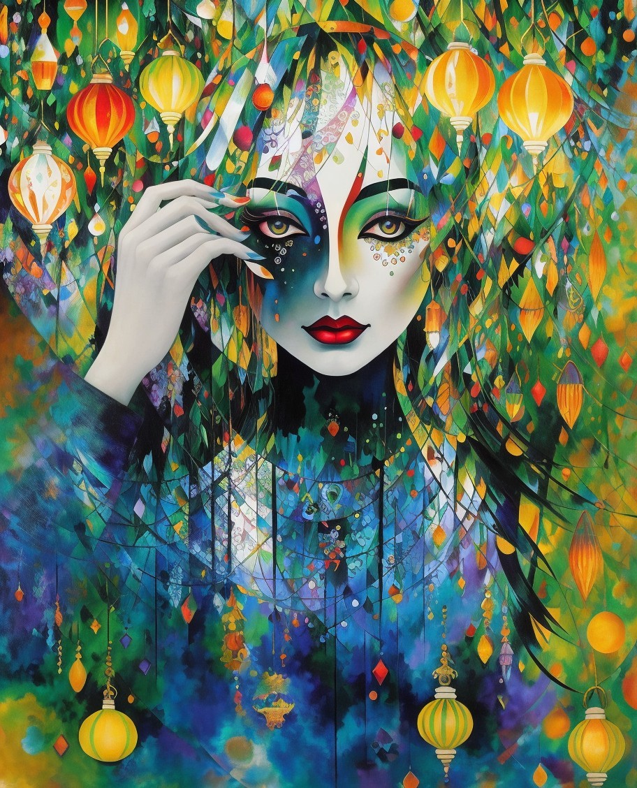 Vibrant painting of a woman with decorative face paint and lanterns