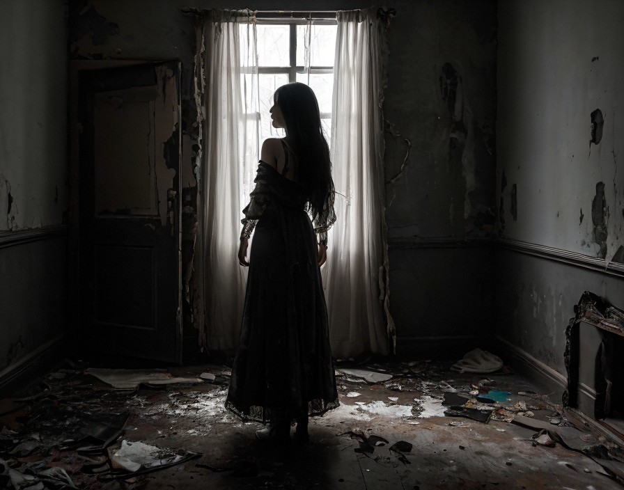 Behind her, the room stretches away into darkness, its walls adorned with peeling wallpaper and cracked plaster. Shadows dance ominously in the corners, hinting at unseen horrors lurking just beyond the edges of perception. A sense of unease fills the air, as if the very walls themselves are whispering secrets best left forgotten.