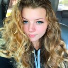 A woman with long, flowing blonde hair and striking makeup smiles at the camera from inside a car, exuding confidence and charm. She wears a stylish outfit, enhancing her radiant look.