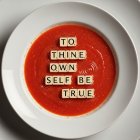A white plate holds a vibrant red soup, with wooden letter blocks arranged in the center spelling "TO THINE OWN SELF BE TRUE," creating a thoughtful and artistic presentation.