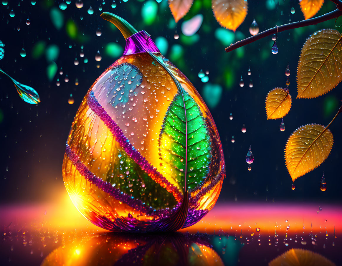 The best AI generated artwork of intensified raindrops splattering onto a crystal gourd under translucent leaves in an opulent garden, centred, bold colours