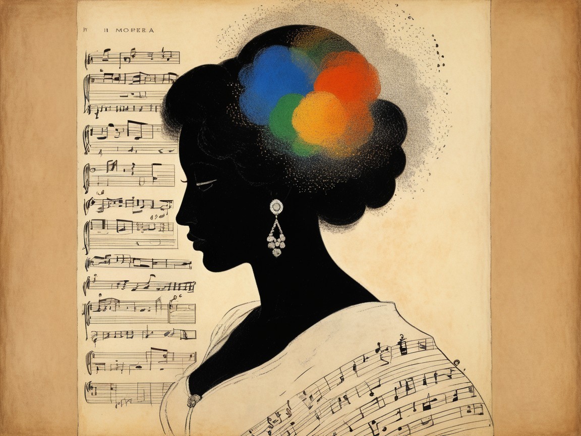 A stylized illustration of a female silhouette with her face in profile, facing left, with an elegant updo hairstyle. Her dark skin contrasts with the light background. Her closed eyelids and demure expression convey a sense of peaceful contemplation. A large, intricate white and silver earring with a circular stud and a