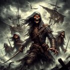 A group of skeletal figures cloaked in tattered robes stands on a rocky shore, wielding torches and brandishing eerie expressions, with a stormy sky and ghostly ships in the background.