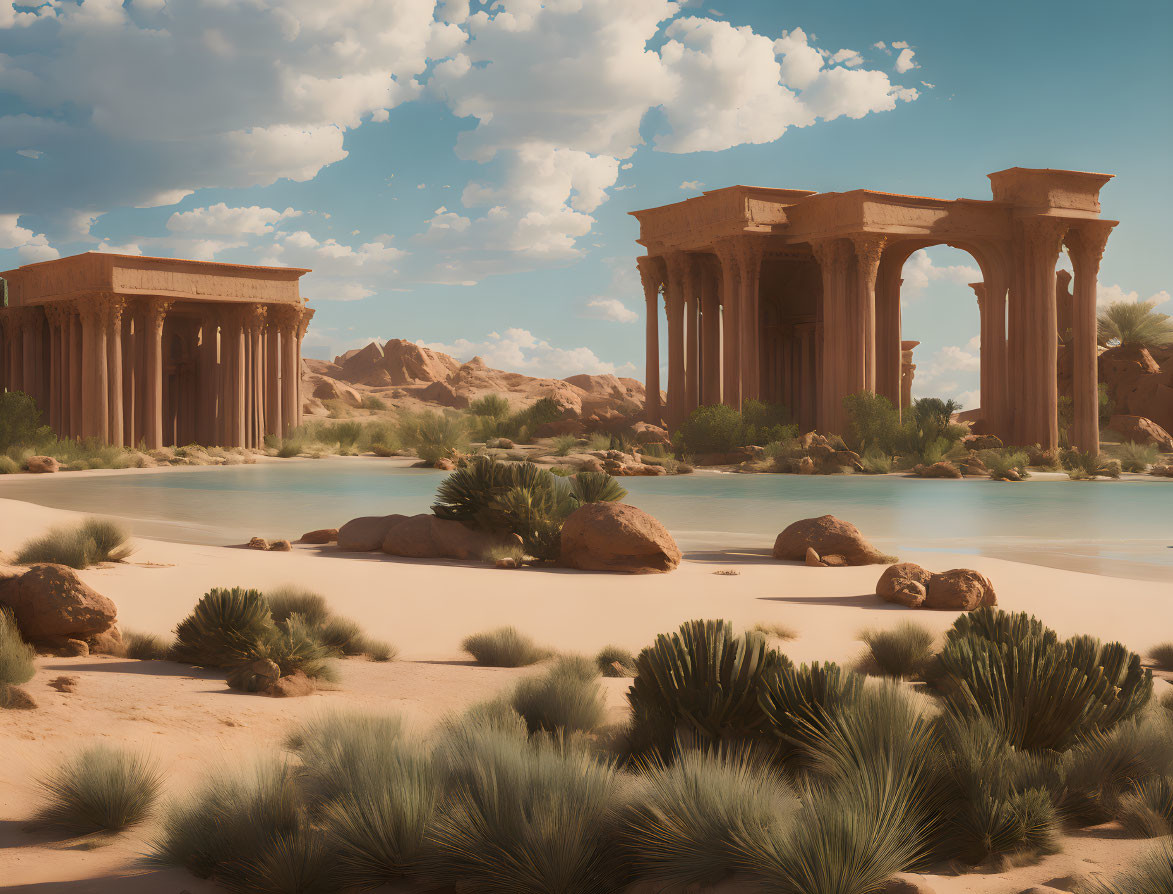 Vivid surreal desert scene: orange sands, teal arches, red rocks, greenery, water