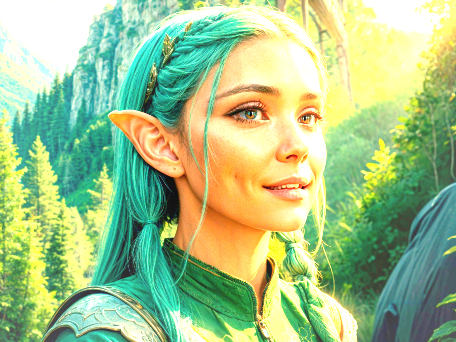The elf paused, her gaze drifting to the horizon as though sensing a call from beyond the forest's edge. A gentle breeze stirred the air, carrying with it the faint scent of blooming flowers and the promise of adventure. With a final glance around her serene surroundings, she took a step forward, her heart alight with the anticipation of journeys yet to come.