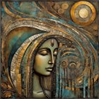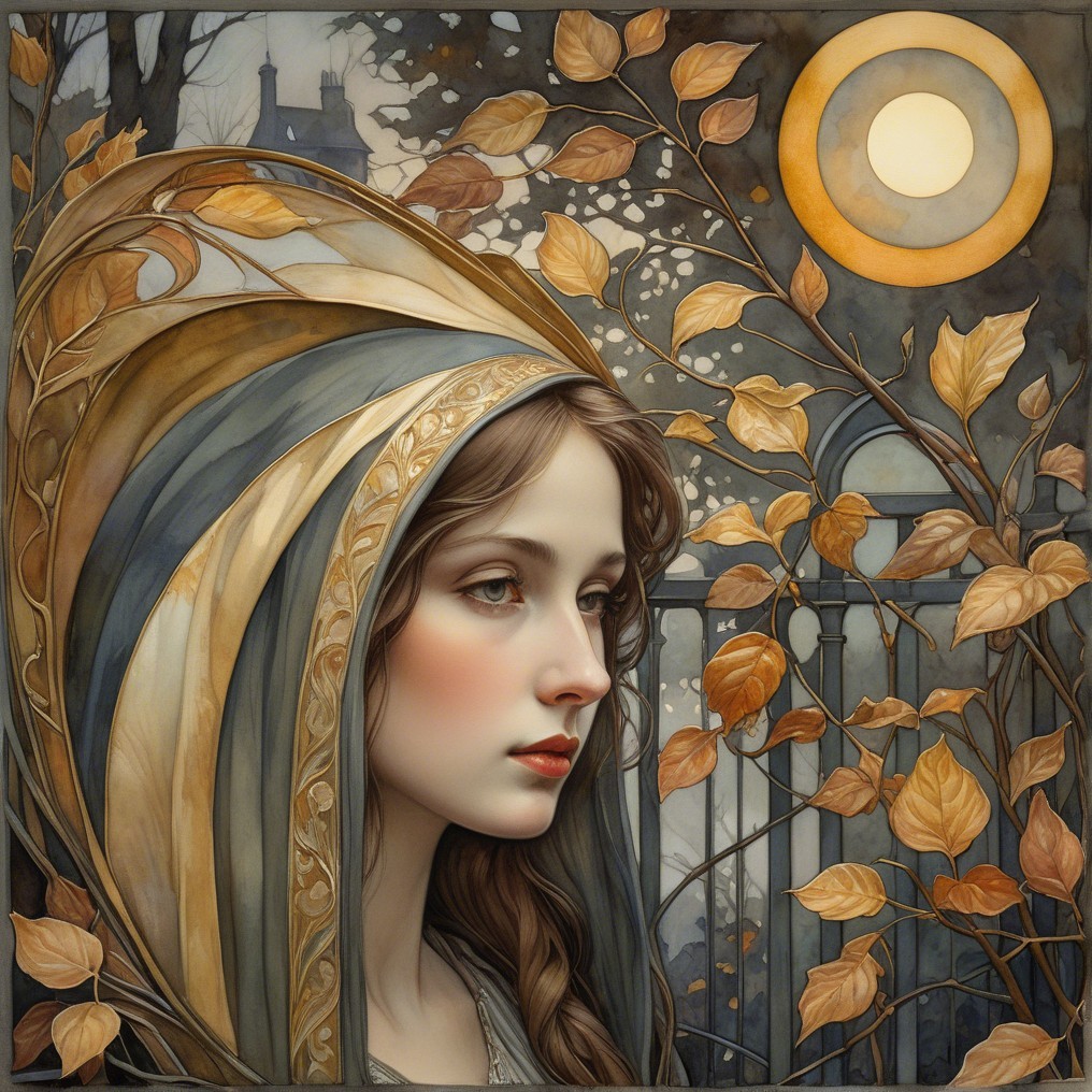 A young woman with flowing hair holds a pumpkin amidst autumn leaves, flanked by two dogs. A serene landscape with a moonlit sky sets a tranquil, magical atmosphere.