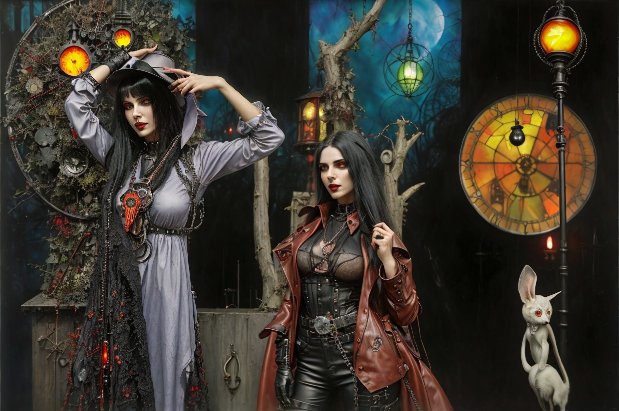 natural beauty of demonic vampire witches, red fangs, steel leather, cybernetic clothes, wire mesh suits, interesting atmosphere