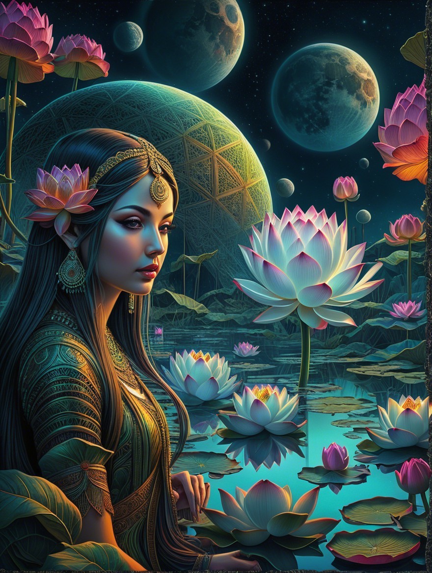 Serene Woman with Jewelry by Tranquil Lotus Pond