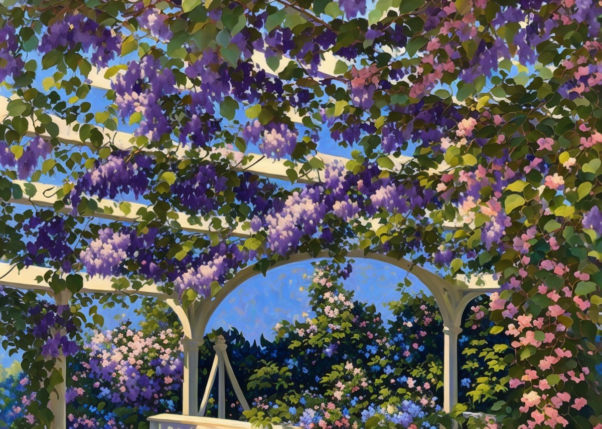 Wisteria and jasmine vines in bloom, draped over a pergola that reveals a sliver of blue sky. Use visible brushwork and a Fauvist palette. Style of Matisse, Marc Chagall, Henri Rousseau, Maxwell Parrish, Alphonse Mucha, Louis Comfort Tiffany