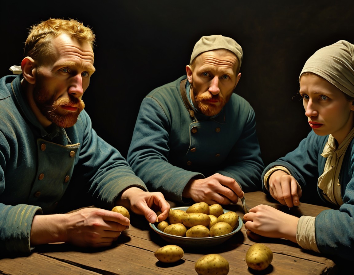Three individuals in old-fashioned attire look intently at potatoes on a wooden table, evoking a classical painting's mood and composition.