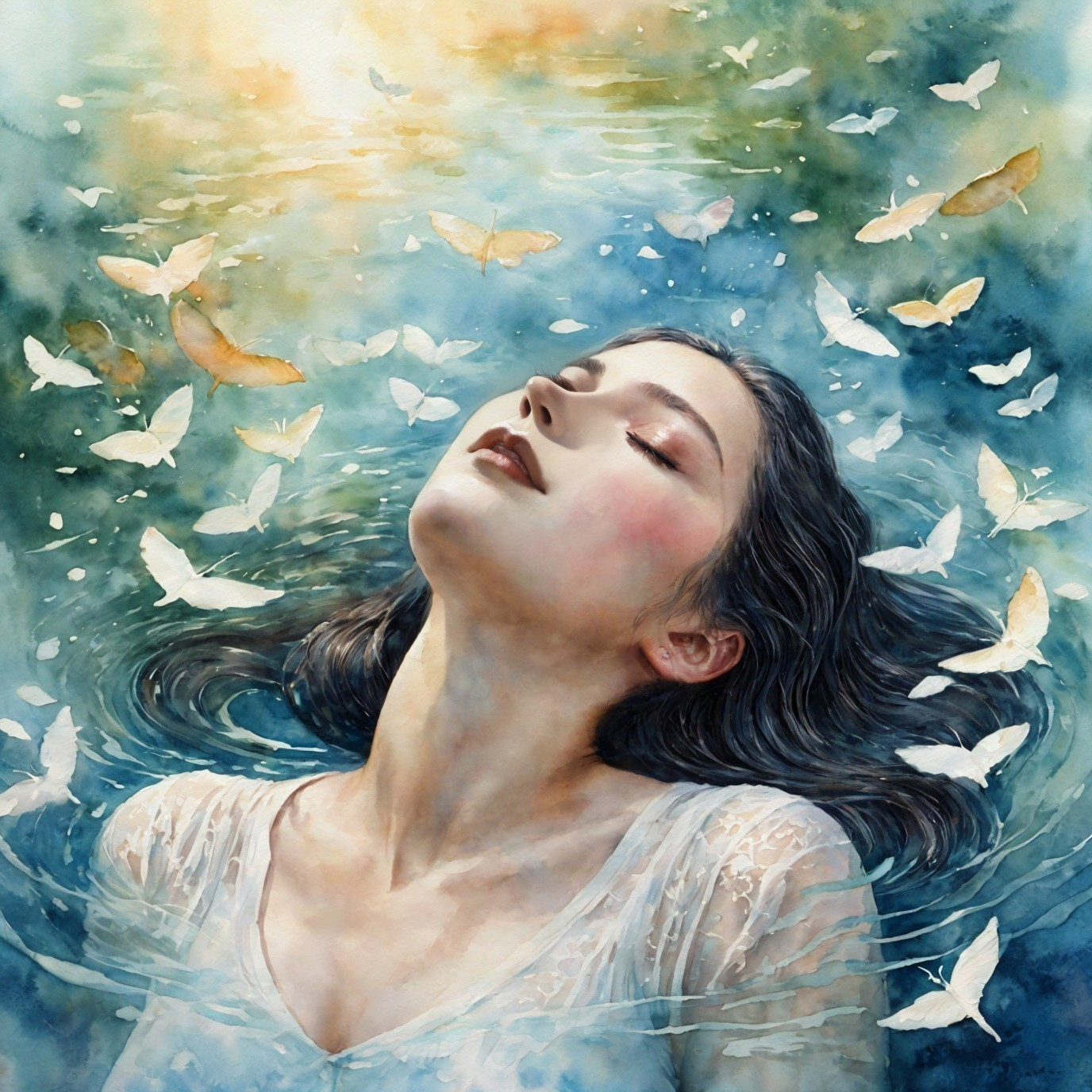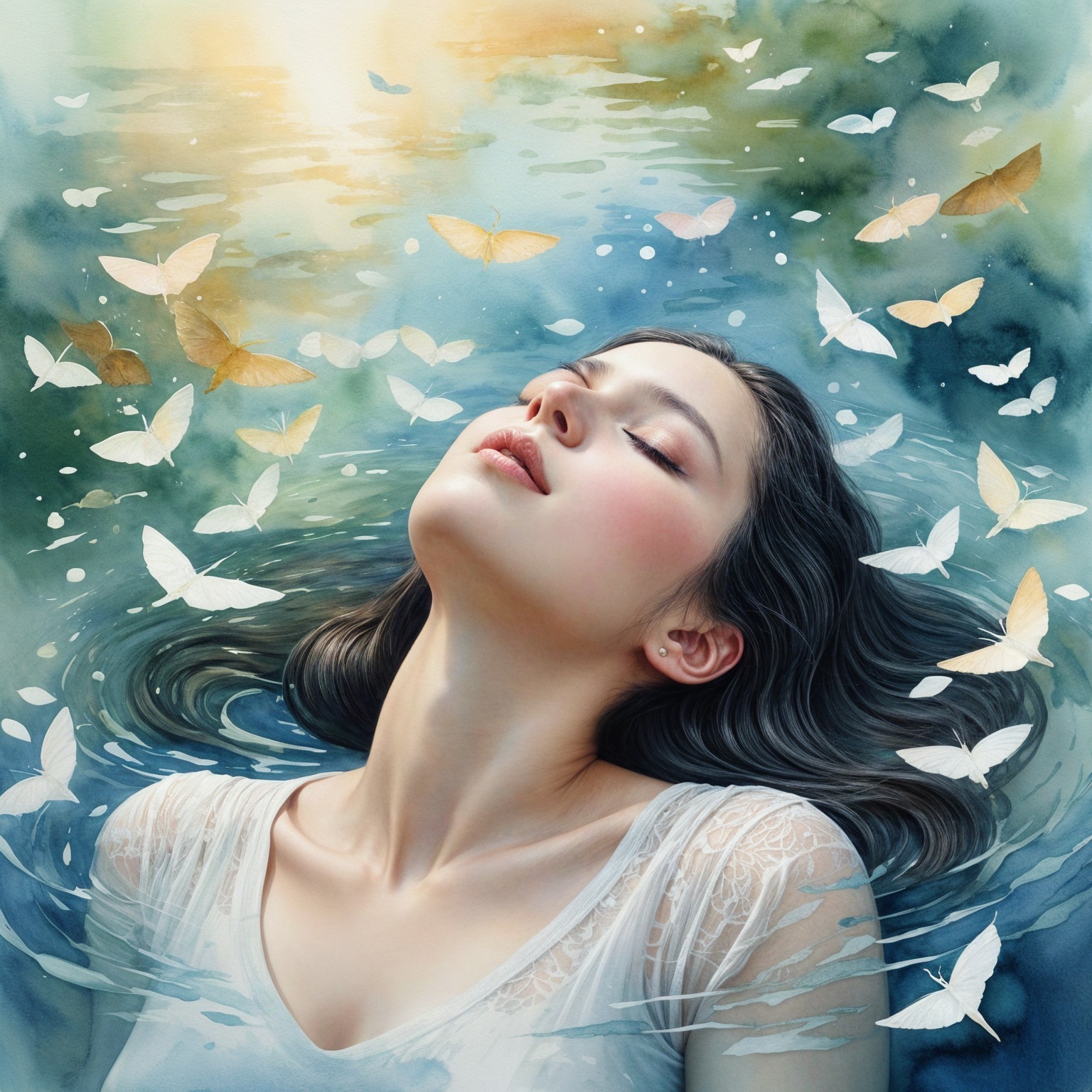 A serene woman floats in water, her eyes closed and expression tranquil. Delicate white butterflies surround her, creating a dreamlike atmosphere amidst soft, colorful reflections.
