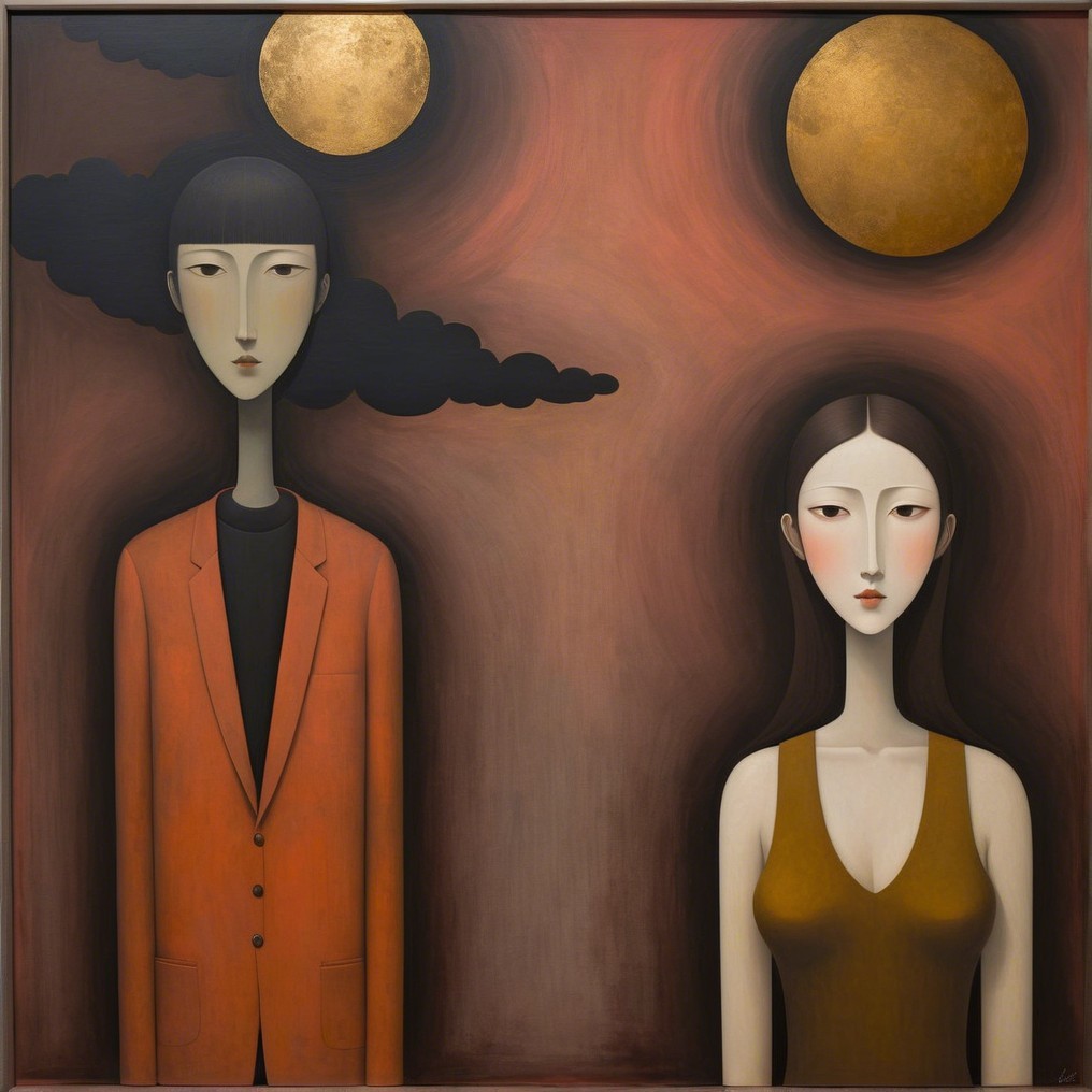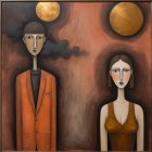The artwork features two stylized figures against a warm, abstract background. One wears a large black hat and a vivid orange suit, while the other is dressed in a simple brown top, both with serene expressions.