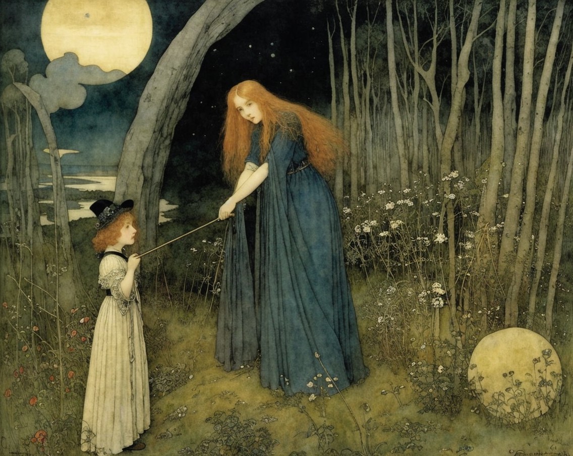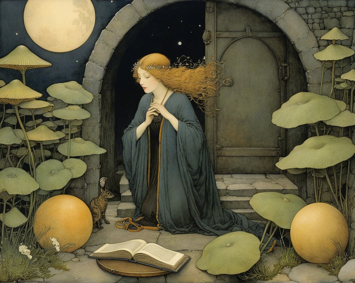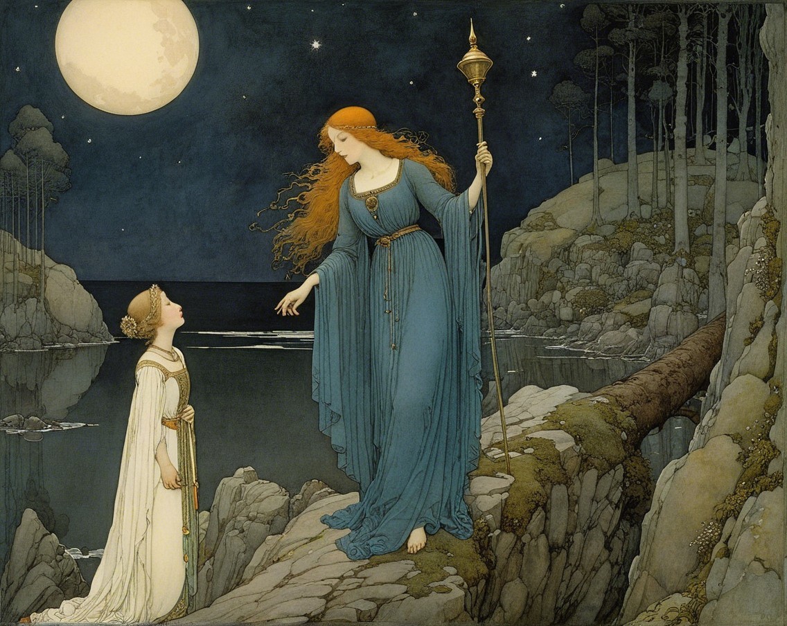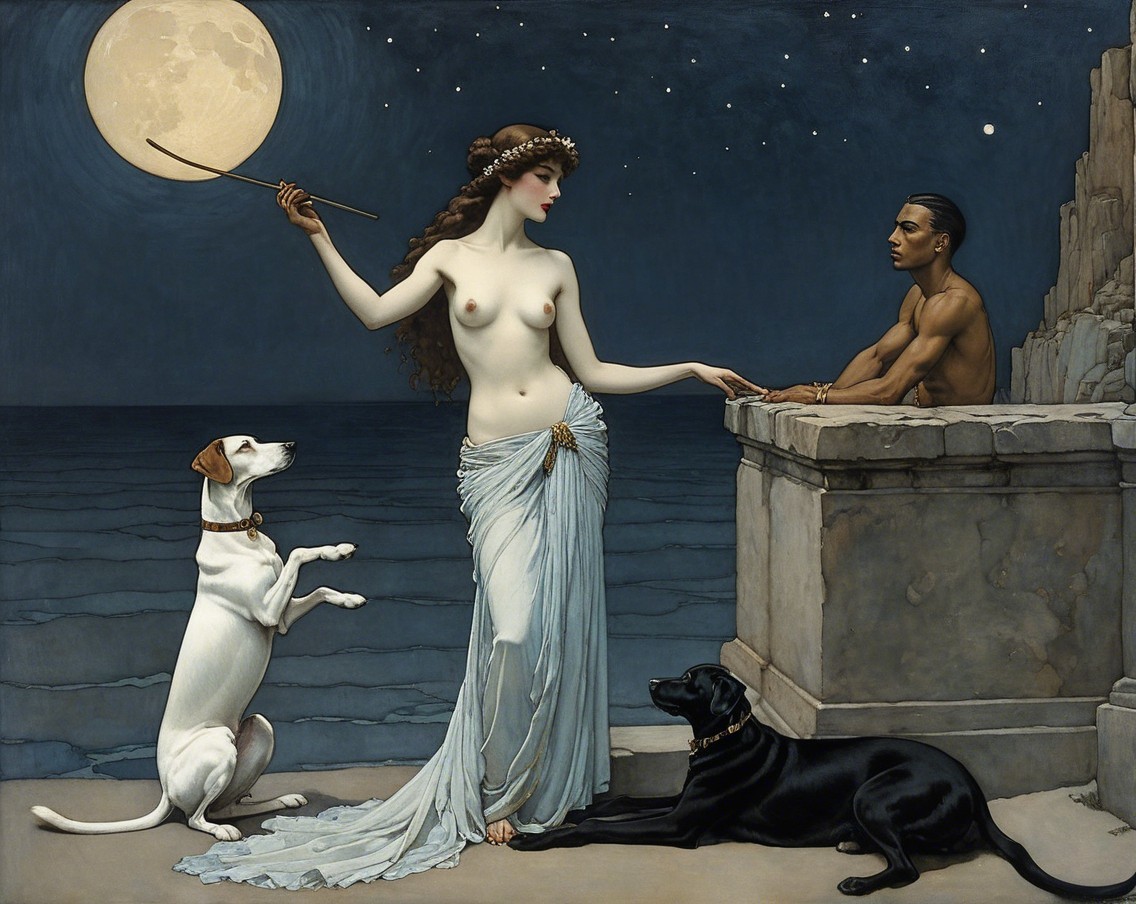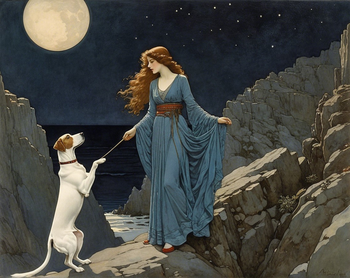 A serene woman in a flowing blue dress sits by the moonlit sea, her loyal black dog beside her. The scene captures a tranquil moment under a bright full moon reflecting on the water.