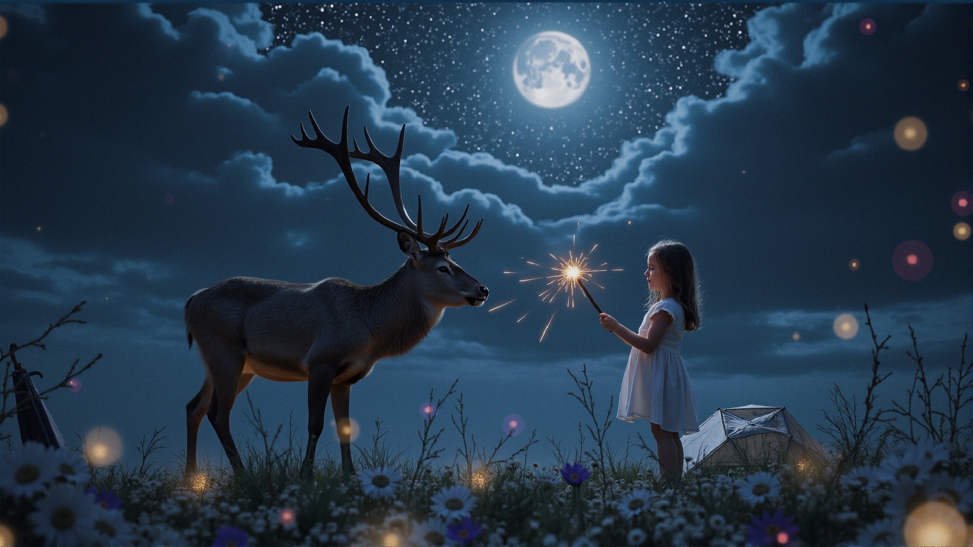 Photorealistic image of a majestic stag standing in a moonlit field under a celestial canopy of stars, its antlers bare branches reaching towards a dreamy blue sky filled with glowing starlight. A young girl in a white dress stands near the deer, holding a magical star-tipped wand that illuminates the deer's side with a warm, golden glow. The surrounding environment includes a subtle field of grass, with an overturned umbrella hinting at a recent rain. The sky is a deep, rich blue with a multitude of twinkling stars, rendered with precise light scattering effects. Cinematic lighting illuminates the deer and girl, casting soft shadows and highlights. Low angle, 35mm lens, shallow depth of field drawing focus to the deer's eye and the girl's wand. Moody color grading with deep blues, hints of purple, and warm gold accents from the starlight. Detailed textures on the deer's fur, the girl's dress, and the grassy field. Atmospheric conditions include a subtle haze, enhancing the ethereal quality of the scene. High-resolution, digitally enhanced with realistic rendering of light sources and particle effects, photographic quality.