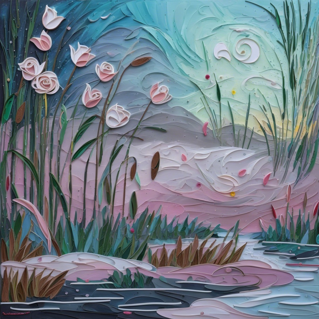A whimsical paper quilling artwork depicting a serene landscape with flowing water, colorful flowers, and a soft, swirling sun, creating a calm and enchanting atmosphere.