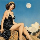 A serene scene features a girl in a flowing dark dress adorned with golden dots, sitting on a stone ledge by the ocean. She gazes at the moon, as a bird flutters nearby, surrounded by flowers.