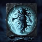 Prompt: A ghostly figure emerging from a mystical portal, shrouded in flowing, tattered robes. The figure has an eerie, elongated face with glowing eyes, and its body is entwined with dark, branch-like tendrils. The portal itself is circular, framed by ancient stone with intricate carvings, and emits a soft, eerie blue glow. Surrounding the portal are fragmented stones, adding to the mystical atmosphere, while the background is a deep shadowy blue, enhancing the supernatural feel of the scene.