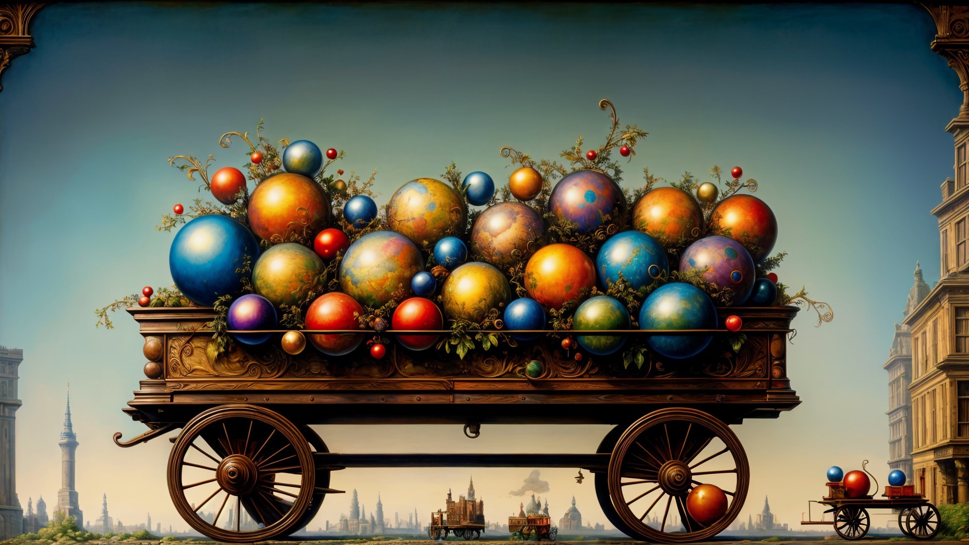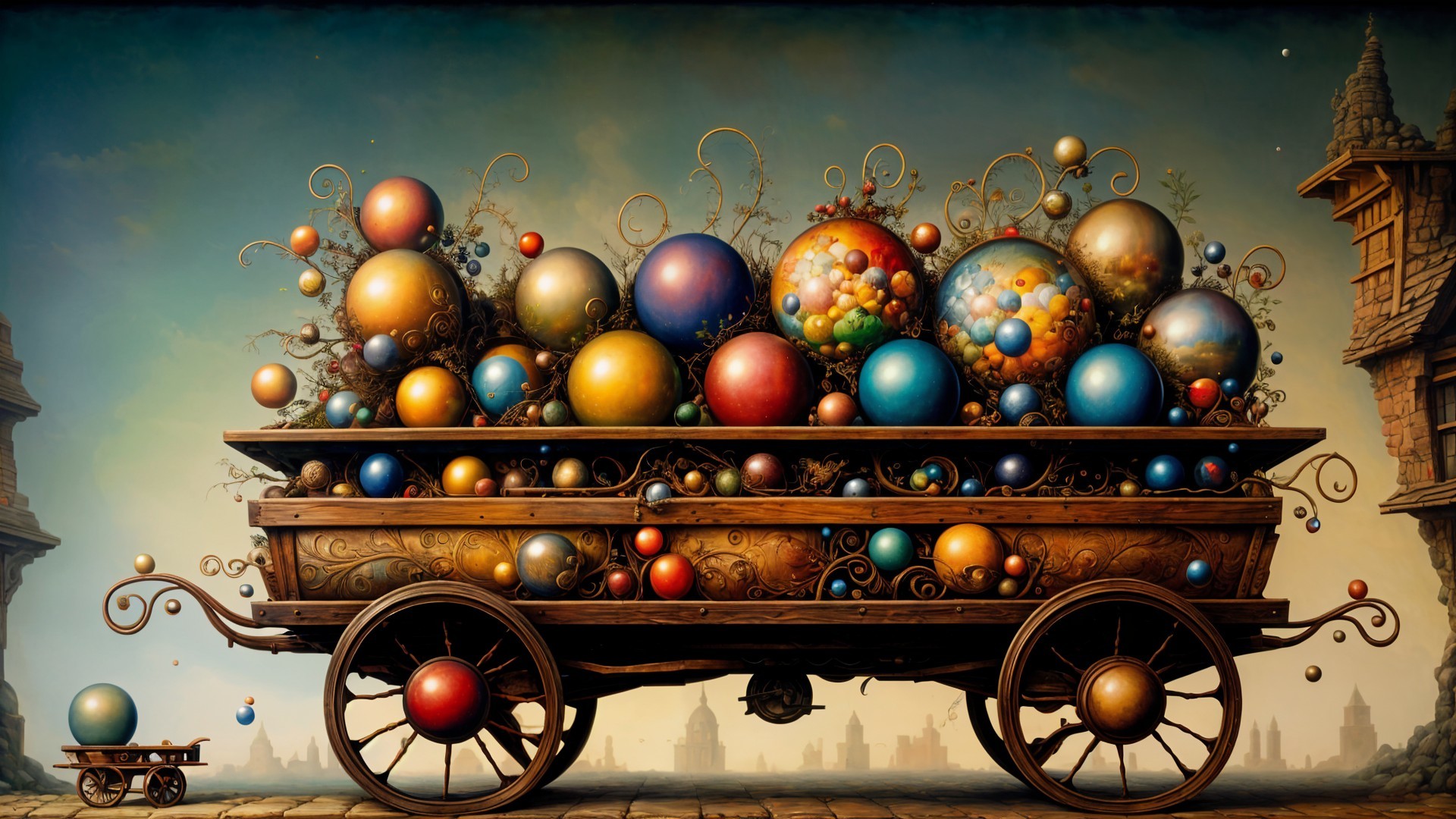 A whimsical wooden cart overflowing with colorful, marbled orbs rolls across a breathtaking landscape, where distant spires emerge against a vibrant sky, evoking a sense of wonder and magic.