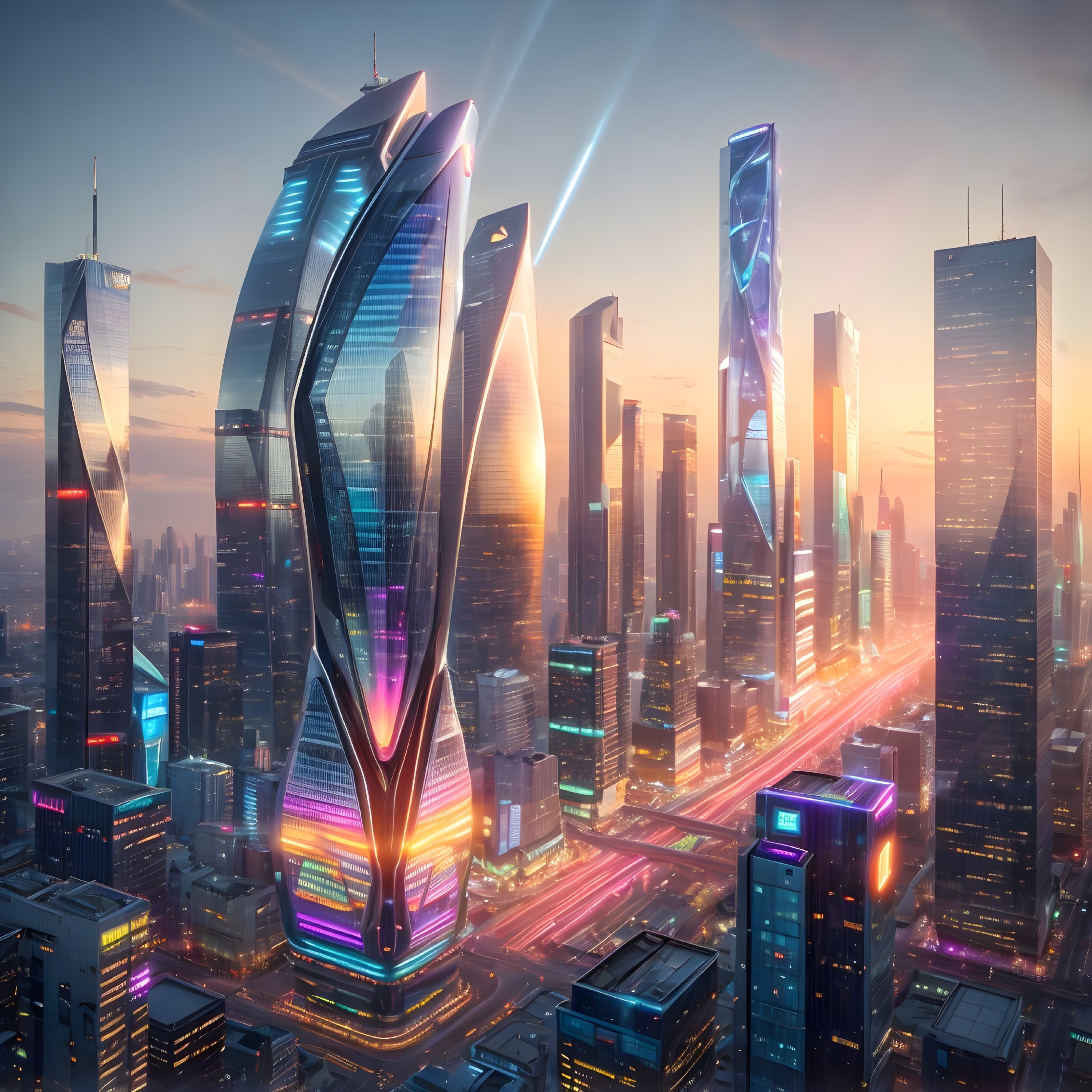 A futuristic city skyline at sunset with sleek skyscrapers, vibrant neon lights, and busy traffic lanes glowing with movement.