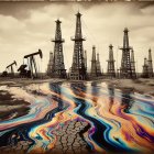 A landscape featuring multiple tall, slender wooden oil derricks, similar in structure and style to early 20th-century oil rigs seen in historical black and white photographs. The ground is dry, cracked earth with viscous, iridescent liquid pooling and flowing, showing colors of black, deep blue, and a shimmering, oil-on-water effect. The sky is overcast, with a slightly dirty or polluted appearance, maintaining an overall color palette of deep blues, golden yellows, and earthy browns, with a hint of industrial gloom.