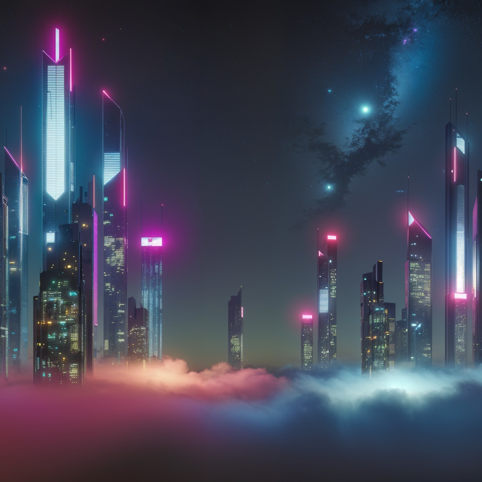A futuristic skyline at night features towering skyscrapers illuminated with vibrant neon lights. Soft clouds drift below, creating a surreal atmosphere in a bustling cityscape.