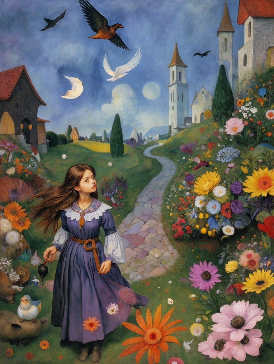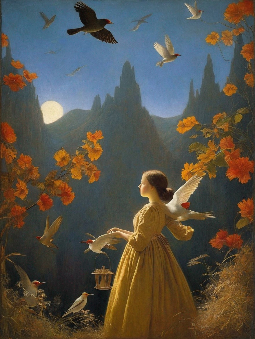 A woman in a yellow dress sits by the water at night holding a bird, with a boat and moon reflected below.