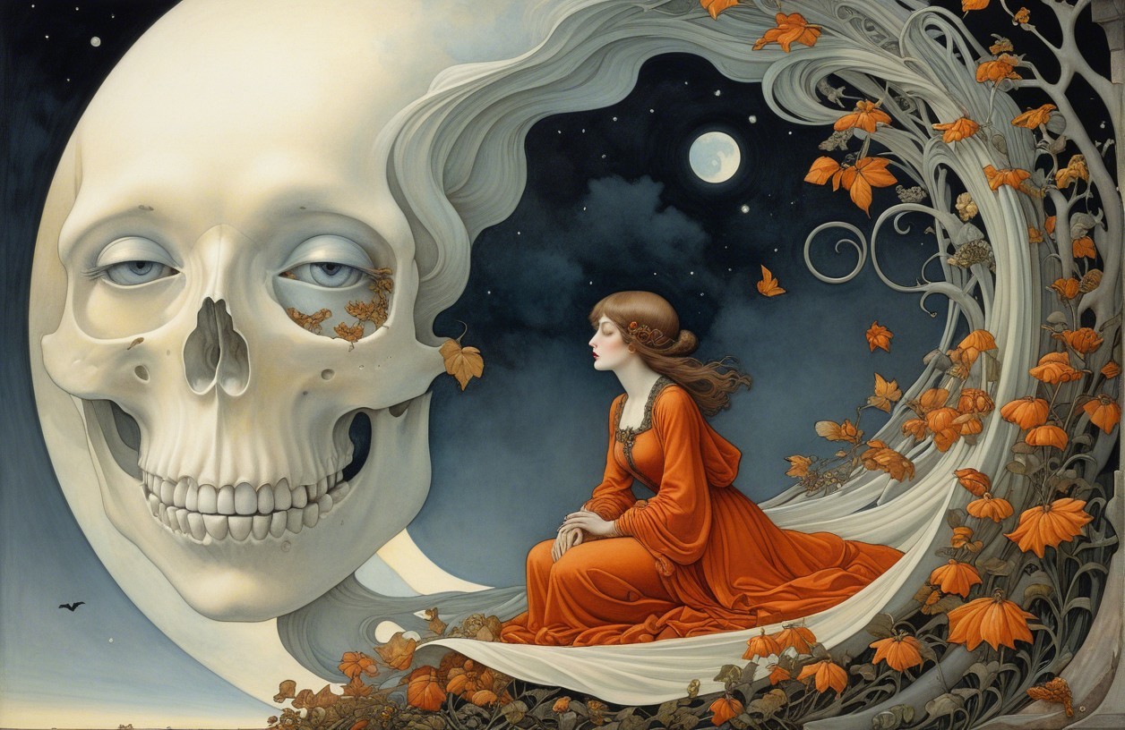 A surreal scene featuring a large, serene face merging with the moon, while a woman in an orange dress sits among stylized flowers, set against a starry night sky.