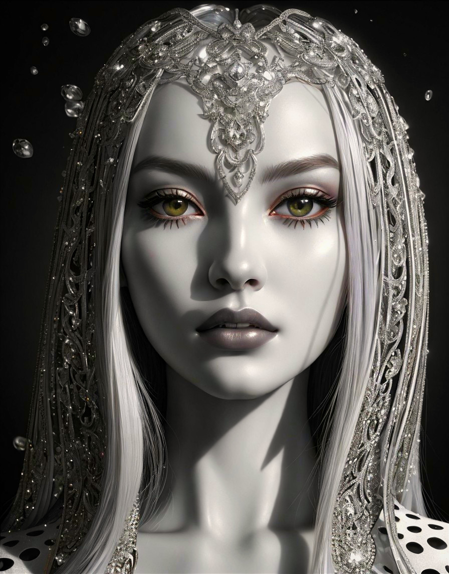 A digital artwork of a woman with silver hair, adorned with a bejeweled headpiece, surrounded by floating crystals against a dark background.