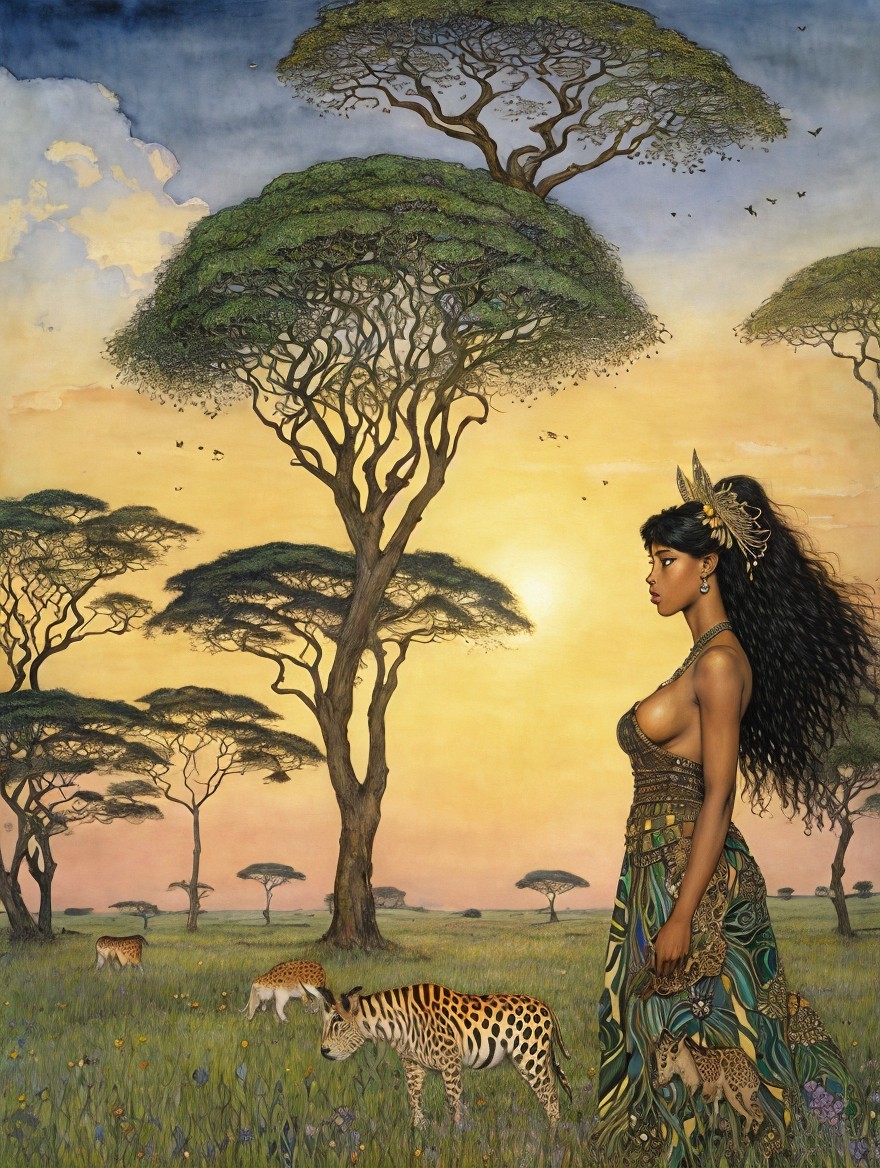 A serene illustration of a woman sitting in a savannah with acacia trees, tall grass, and birds under a sunset sky.
