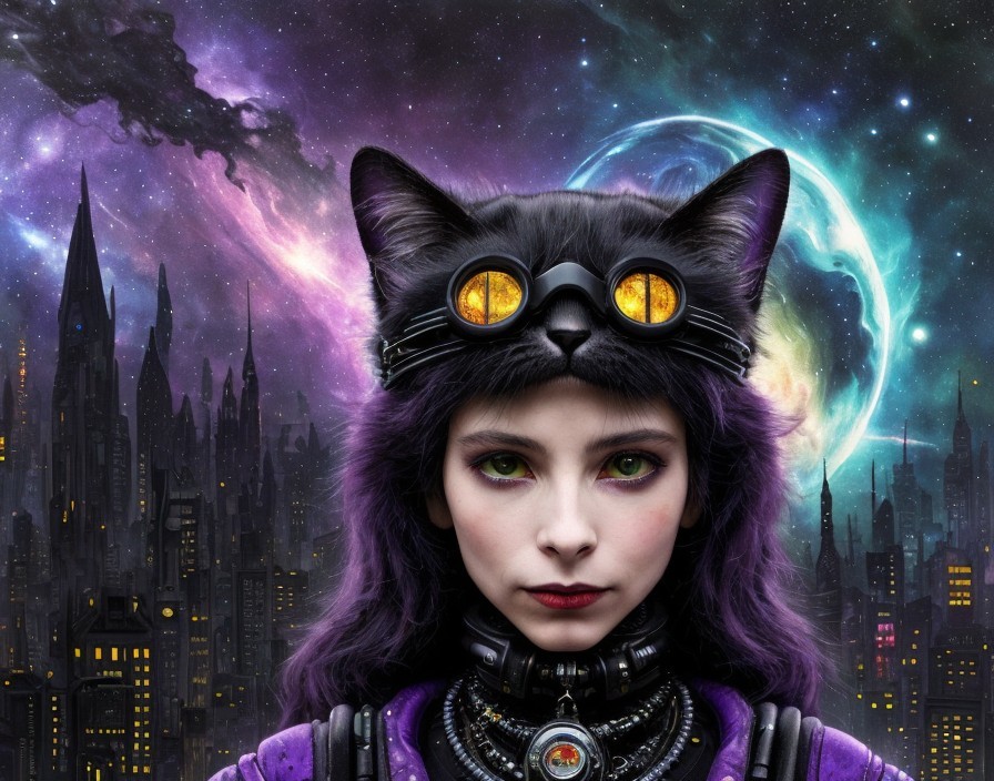 A cyberpunk witch with cat on head, living in a nebula, Egon Schiele and Tim Burton,space sci-fi, mixed media, miniature. Cosmic. Cityscape, Gustav Klimt and Bill Sienkiewicz, intricate high detail crisp quality cosmic