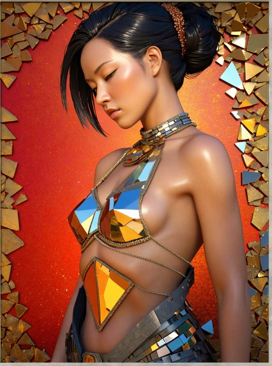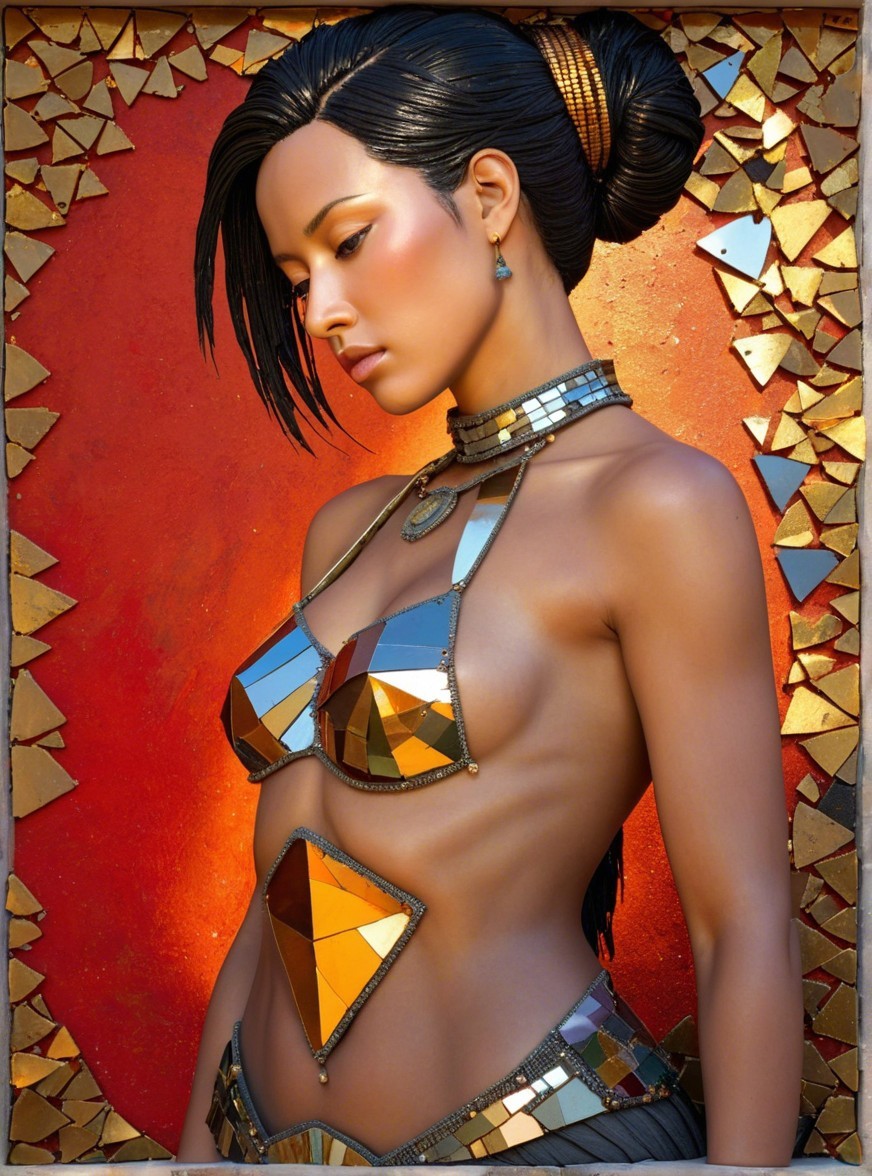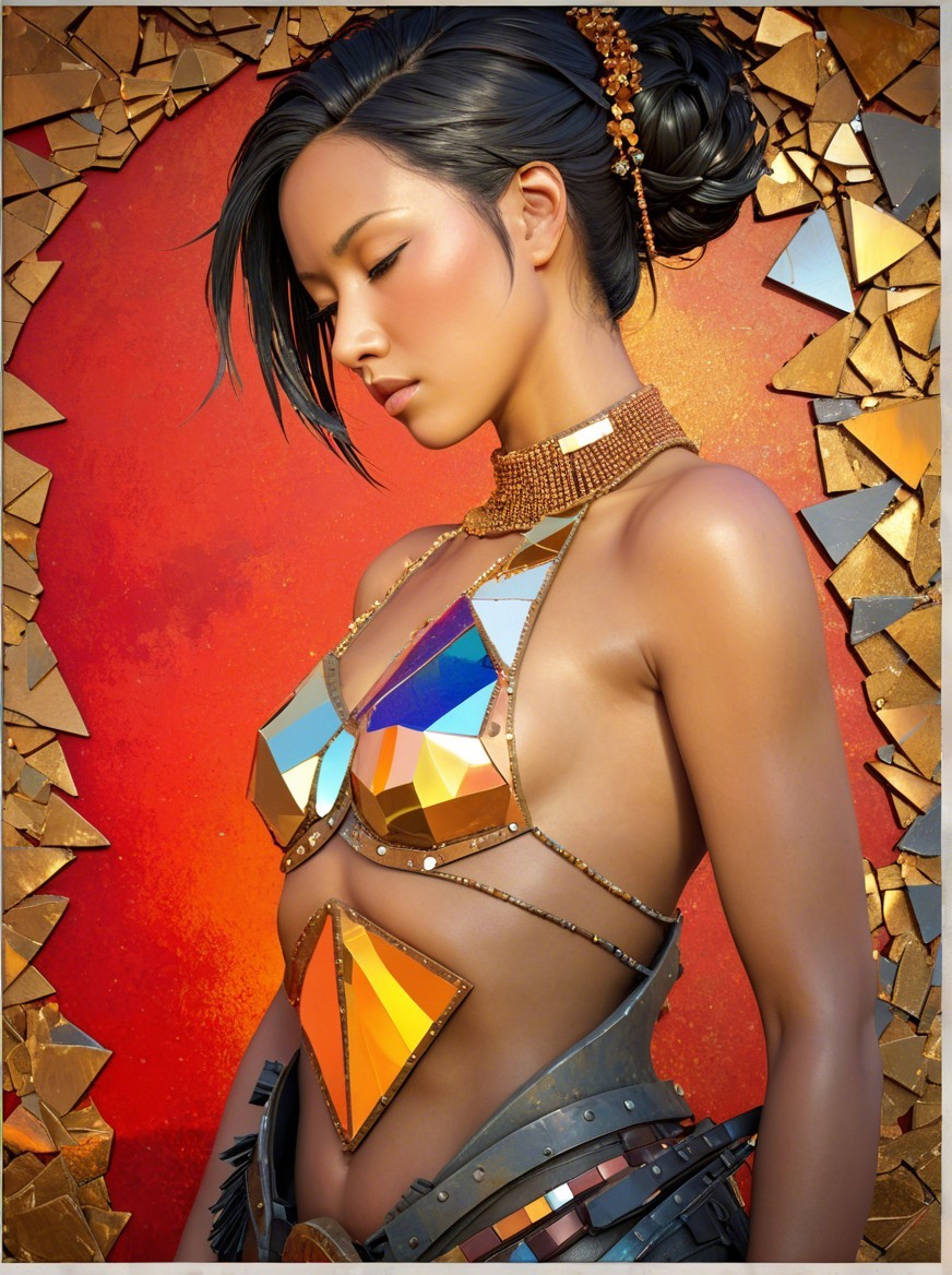Prompt: Upper body portrait, mosaic entirely composed of small shattered pieces of metal: iron, mica, beads, tinc, bronze, copper and gold, phong shading 1.3, byzantine face type, amaranth-red gradients, patchwork of textiles, multi-layered eyes, raytraced shadows 1.2, texture mapping, plasticity 1.3, embodiment made entirely of shards, blades, flakes, scrapers, burins, slightly surreal, cel-shaded bas-reliefs of fragmented shards and tiles, watercoloring by Man Ray and Pierre Molinier, watercolor and ink style by Galina Alexandrovna Smirnova, wire details, hues, stylized youthful female, Bloom-Effect, subsurface scattering, textured layers, painterly elements, glossy finish, brightness 1.8, plasticity 1.9, dof, debeh, bokeh, HDR, blurred color schemes, watercolor effect, Raytraced shadows, divisionism, sketch art techniques, luminism, sfumato-effect, shadow mapping, parallax occlusion techniquesblurry background, unique, zentangle patterns intertwined, contouring reminiscent of Gustav Klimt, shimmering reflections enhancing details, catenaries, shards, flecks, trashy geometric shapes entwined by Man Ray, warm bluish gradients merging seamlessly, gold, bronze, and earthy tones enriching the palette, ornate and decorative elements adorning the composition, soft and warm lighting casting gentle shadows, colorful yam, sketch art influence by Richard Serra evident in the linework, hues inspired by Stan Lee's vibrant style, occult theme, mysterious juvenile, liminal, watercolor and ink in fine-line style, diffused and dappled chiaroscuro lighting, dystopian, cel-shaded style, Henri de Toulouse-Lautrec influence,