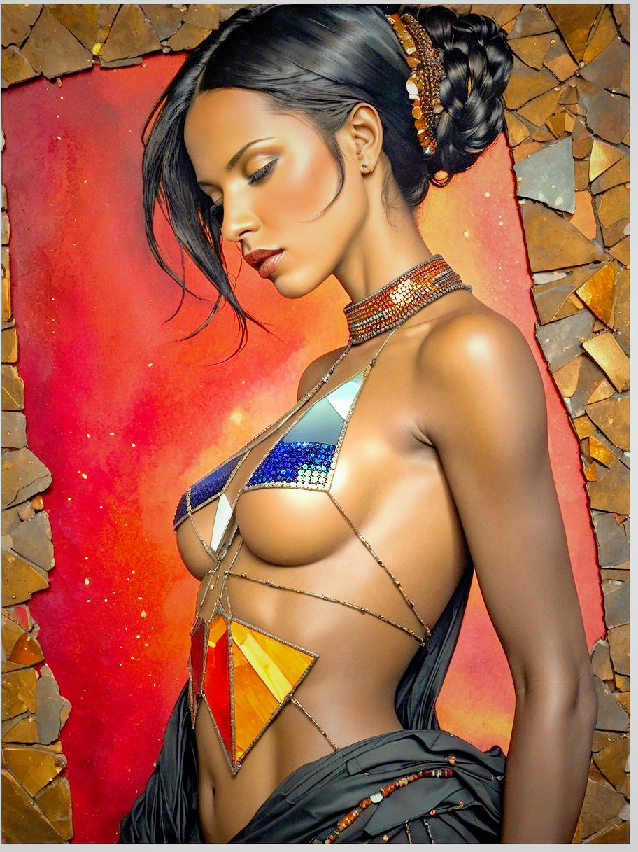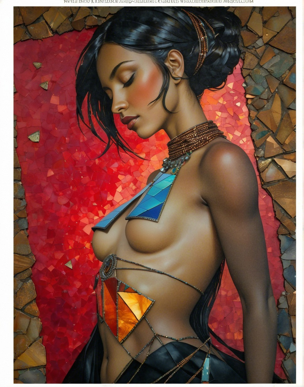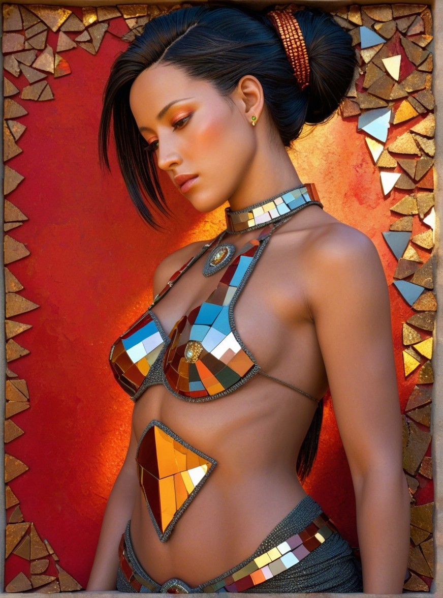 Prompt: Upper body portrait, mosaic entirely composed of small shattered pieces of metal: iron, mica, beads, tinc, bronze, copper and gold, phong shading 1.3, byzantine face type, amaranth-red gradients, patchwork of textiles, multi-layered eyes, raytraced shadows 1.2, texture mapping, plasticity 1.3, embodiment made entirely of shards, blades, flakes, scrapers, burins, slightly surreal, cel-shaded bas-reliefs of fragmented shards and tiles, watercoloring by Man Ray and Pierre Molinier, watercolor and ink style by Galina Alexandrovna Smirnova, wire details, hues, stylized youthful female, Bloom-Effect, subsurface scattering, textured layers, painterly elements, glossy finish, brightness 1.8, plasticity 1.9, dof, debeh, bokeh, HDR, blurred color schemes, watercolor effect, Raytraced shadows, divisionism, sketch art techniques, luminism, sfumato-effect, shadow mapping, parallax occlusion techniquesblurry background, unique, zentangle patterns intertwined, contouring reminiscent of Gustav Klimt, shimmering reflections enhancing details, catenaries, shards, flecks, trashy geometric shapes entwined by Man Ray, warm bluish gradients merging seamlessly, gold, bronze, and earthy tones enriching the palette, ornate and decorative elements adorning the composition, soft and warm lighting casting gentle shadows, colorful yam, sketch art influence by Richard Serra evident in the linework, hues inspired by Stan Lee's vibrant style, occult theme, mysterious juvenile, liminal, watercolor and ink in fine-line style, diffused and dappled chiaroscuro lighting, dystopian, cel-shaded style, Henri de Toulouse-Lautrec influence,