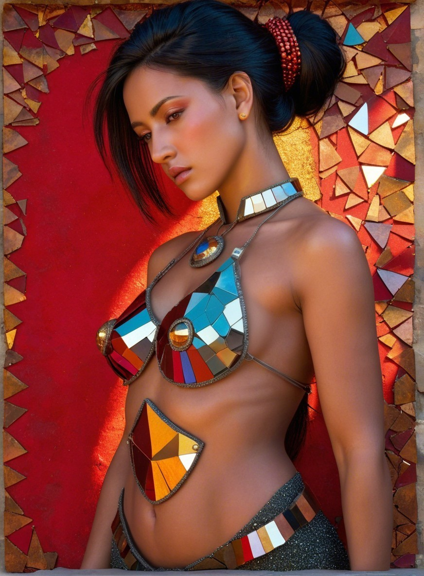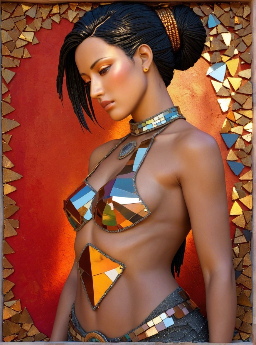 Upper body portrait, mosaic entirely composed of small shattered pieces of metal: iron, mica, beads, tinc, bronze, copper and gold, phong shading 1.3, byzantine face type, amaranth-red gradients, patchwork of textiles, multi-layered eyes, raytraced shadows 1.2, texture mapping, plasticity 1.3, embodiment made entirely of shards, blades, flakes, scrapers, burins, slightly surreal, cel-shaded bas-reliefs of fragmented shards and tiles, watercoloring by Man Ray and Pierre Molinier, watercolor and ink style by Galina Alexandrovna Smirnova, wire details, hues, stylized youthful female, Bloom-Effect, subsurface scattering, textured layers, painterly elements, glossy finish, brightness 1.8, plasticity 1.9, dof, debeh, bokeh, HDR, blurred color schemes, watercolor effect, Raytraced shadows, divisionism, sketch art techniques, luminism, sfumato-effect, shadow mapping, parallax occlusion techniquesblurry background, unique, zentangle patterns intertwined, contouring reminiscent of Gustav Klimt, shimmering reflections enhancing details, catenaries, shards, flecks, trashy geometric shapes entwined by Man Ray, warm bluish gradients merging seamlessly, gold, bronze, and earthy tones enriching the palette, ornate and decorative elements adorning the composition, soft and warm lighting casting gentle shadows, colorful yam, sketch art influence by Richard Serra evident in the linework, hues inspired by Stan Lee's vibrant style, occult theme, mysterious juvenile, liminal, watercolor and ink in fine-line style, diffused and dappled chiaroscuro lighting, dystopian, cel-shaded style, Henri de Toulouse-Lautrec influence,