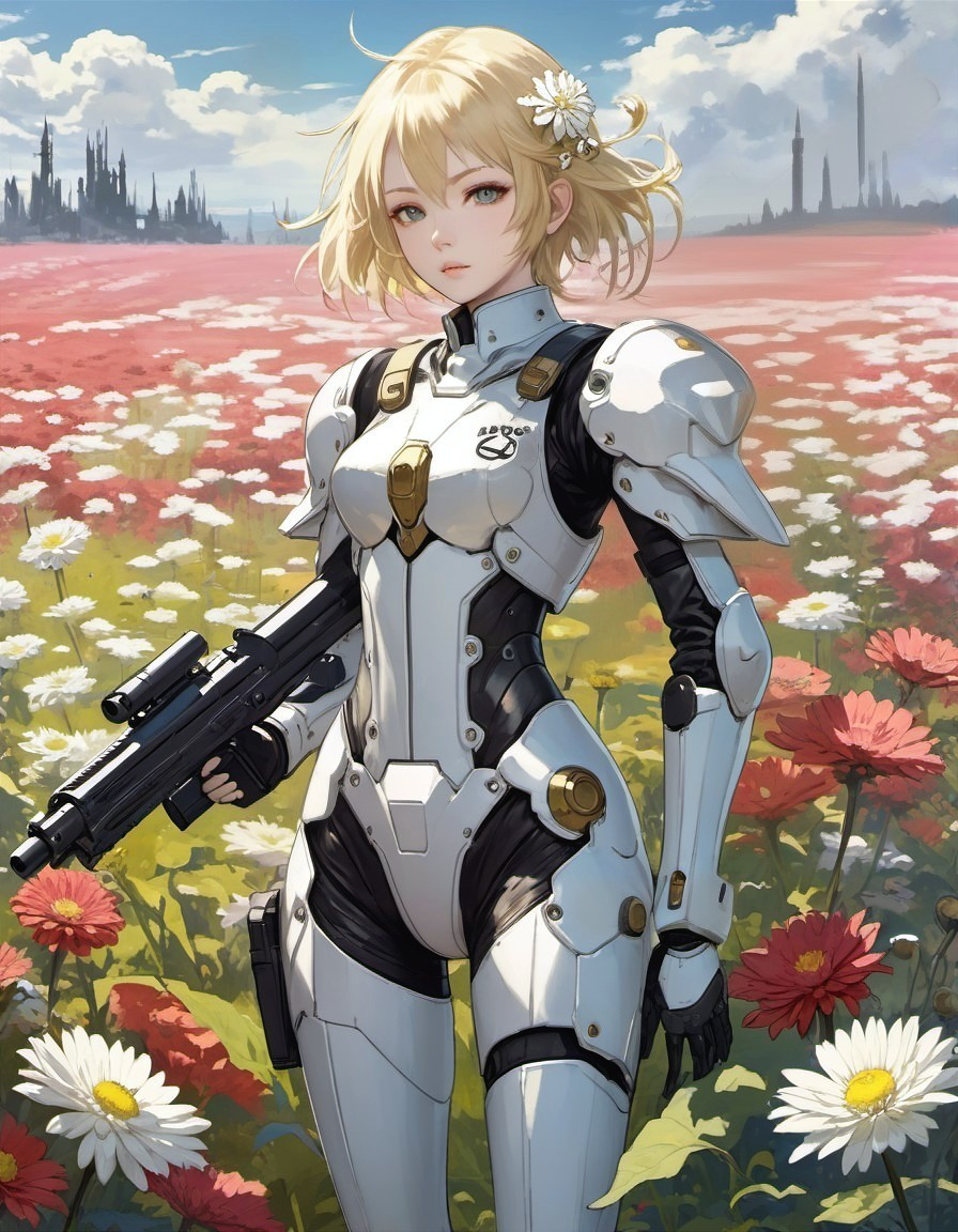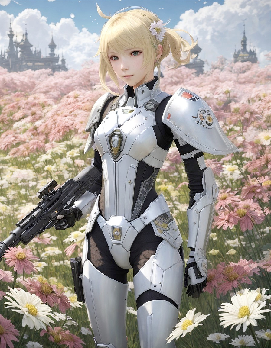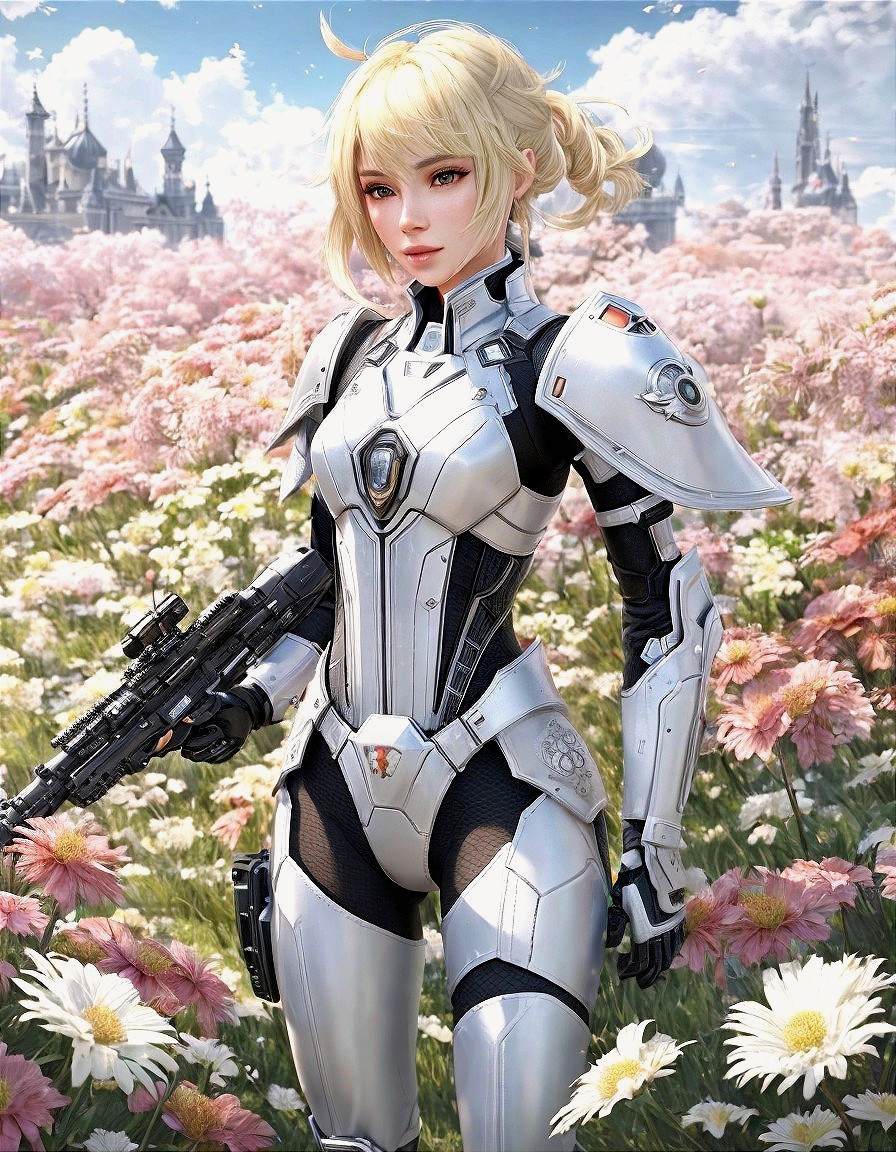 ("Try it" from Rukoed + Ai Upscaled) - A blond woman in futuristic white armor stands in a field of pink flowers with a castle in the distance and a gun in hand.