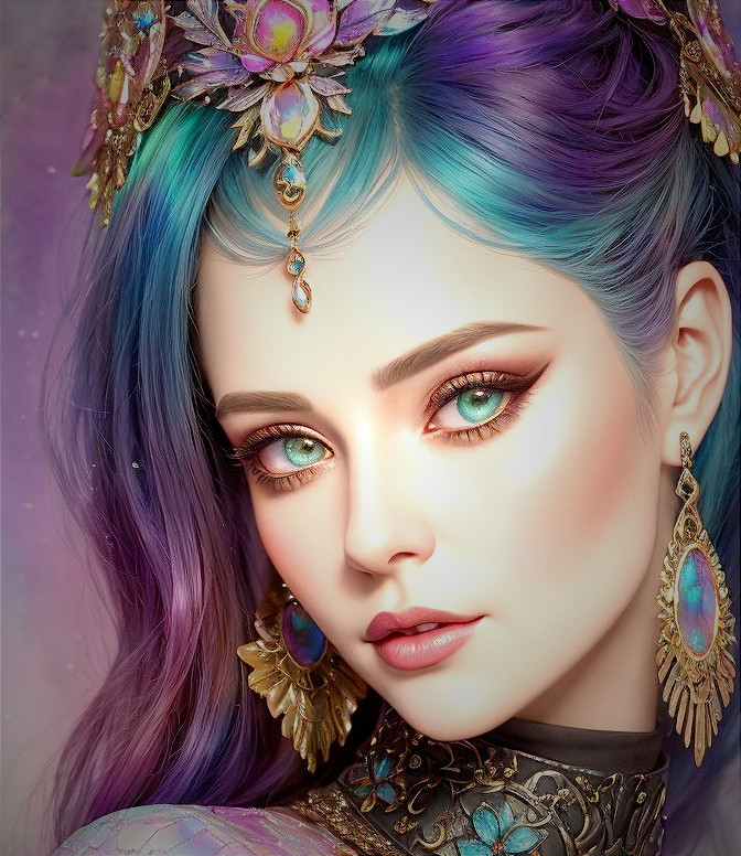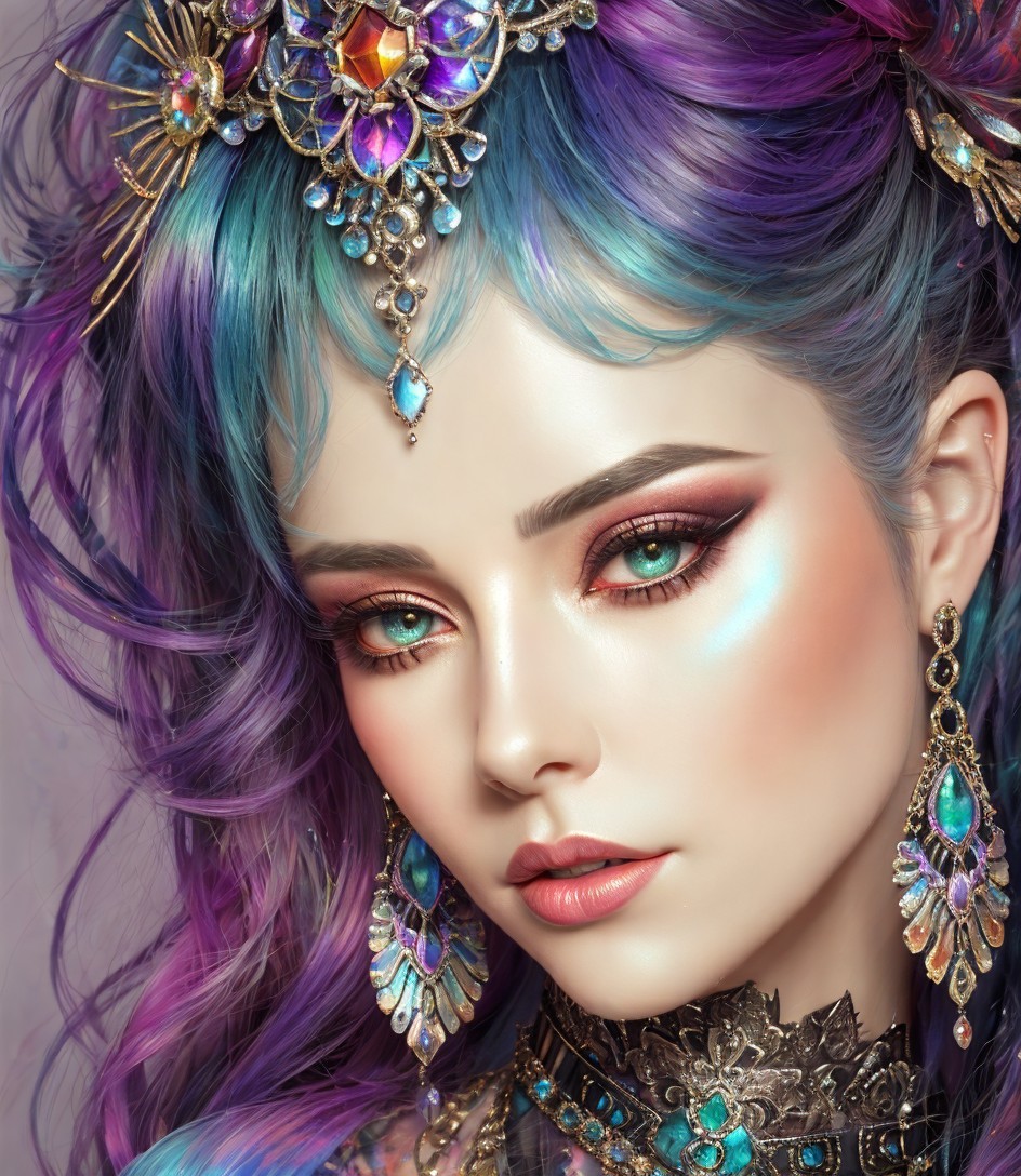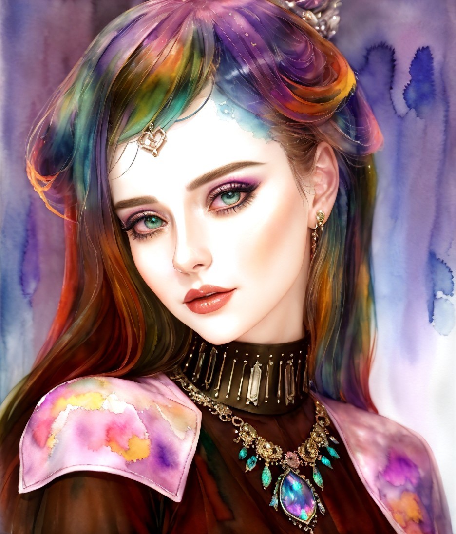 3D portraiture, beautiful female ghost, cunning enchantress with metallic collar, detailed stylized hairstyle in iridescent colors, high coloring 1.4, stylized watercolor and ink painting, subsurface scattering 1.9, head's edges softly diffused, bathing in a dream-like haze, deep shadows mingling with saturated highlights, high contrast with a touch of dethereal glow, ultra fine digital paintingwatercolor alcohol ink, inkpunk 1.8, style of Margaret Keane, wavery texture, vibrant colors, vivid background, encaustic strokes, shiny, spiritual essence, 3d effects 1.8, ambient occlusion 1.5, anisotropic filtering 1.7, shadow mapping 1.3, stylized illustration 1.5, vaporous, creamy, strict, spiritual expression, fairycore, plushy psychpomp scene 1.7, raytraced shadows 1.8, sublime, dethereal, occult, Anglocore 1.9, american gothic 1.7, colorful reflections, triadic color scheme black beige purple, very dimmed lighting, hues, plasticity 1.6, radiance, complexion 1.4, skin textures, nightmarish, octane render illustration, tints of 1970s advertising art, coffinwood style, tints of instaport style 1.6,