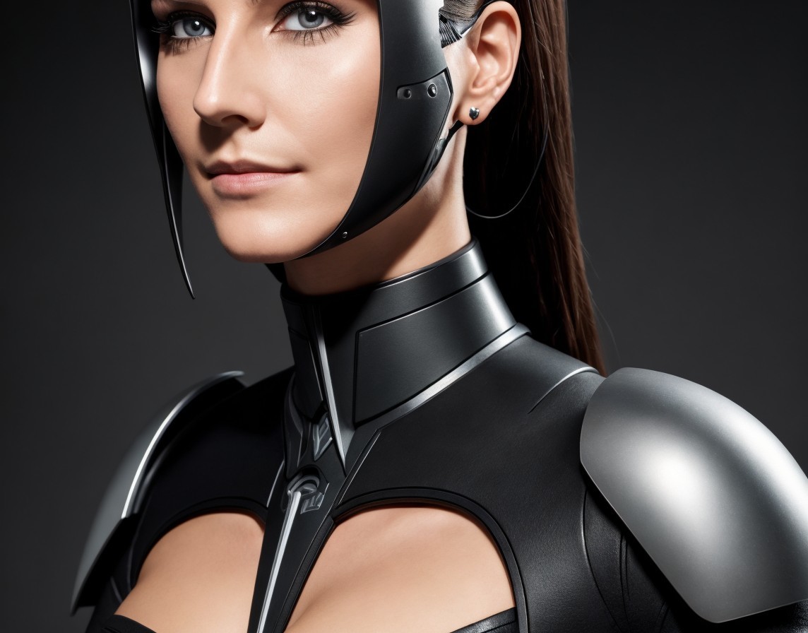A person with cybernetic enhancements against a dark background, portraying a futuristic and sleek appearance.
