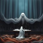 In a surreal, atmospheric scene, a ghostly figure with long flowing hair and a smooth, featureless face hovers above a lavishly dressed table. Below, a second ethereal figure, cloaked in a flowing white gown, sits at the table, reaching out as if communicating with the airy specter above. The backdrop is a vast, draped curtain in deep blues and greys, creating an eerie, mystical ambiance. Wispy tendrils of hair and ethereal elements swirl around, while shadowy figures are faintly visible in the background, adding to the haunting yet mesmerizing feel of the scene.