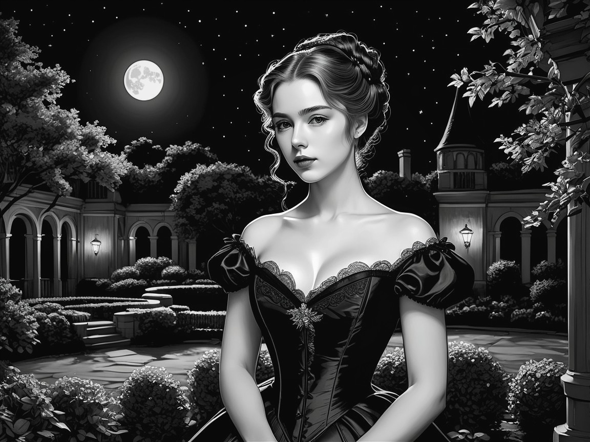 (Try from Jenra) - A stunning woman in an elegant black dress stands in a moonlit garden, surrounded by lush greenery and classic architecture, evoking a romantic, mysterious atmosphere.