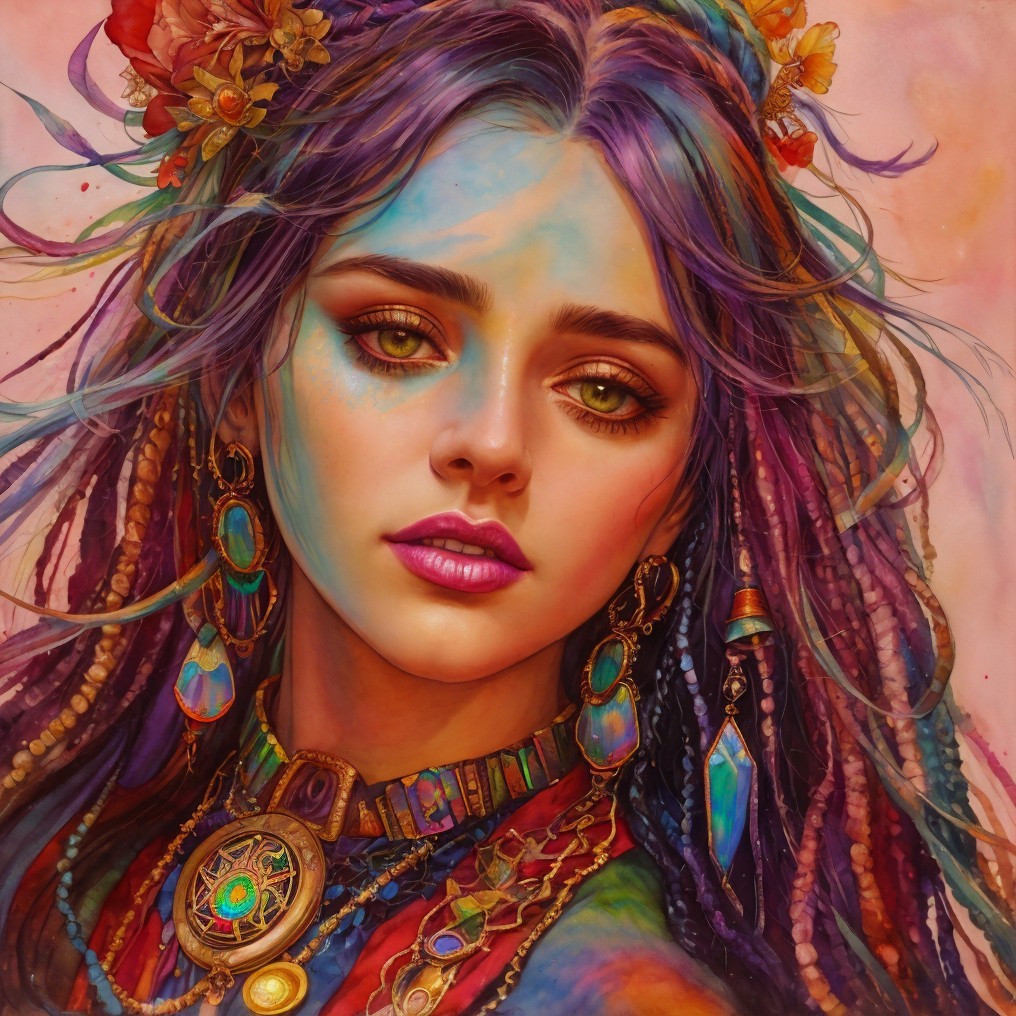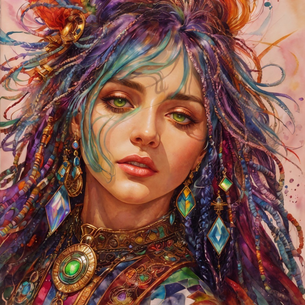 Watercolor and ink illustration, headshot with aura, Handsome priestess with green dreadlocks, messy hairstyle, intricate details and bold lines, fuzzy, scruffy, shabby chic, flowing, action pose, illustrative style by Micheal cheval, Arlie Opal, Overton Loyd, Frank Miller, Georgia O'Keeffe, Charles Rennie Mackintosh, Margaret Keane, tints of instaport style, mosaic, hues, encaustic texture, gradient inking colors, beautiful, dreamscape, decoupage, crisp, octane render illustration 1.5, tints of comic book art 1.7, grunge, american gothic 1.5, curly hairdo, ink splashes 1.9, triadic color scheme red brown auburn, Figurative Art, epic, complex filigree, inkpunk 1.8, tints of 1970s advertising art, 3d effects 1.8, shadow mapping 1.3, dynamic lighting 1.7, soft rounded edges, ambient occlusion 1.5, tints of anthotype print, anisotropic filtering 1.7, dimmed dynamic lighting, brushstroke fields, beautiful composition,brightness 1.9, layered geometrical vector art, fauvistic style 1.6, quilling, quaint, limited palette, delicate coloring, octane render illustration 1.5, brightness 1.9, vector 9:5, beautiful composition, joyful essence