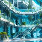 A modern, multi-level atrium featuring sleek glass and metal design elements. Lush greenery and water features create a serene atmosphere, complemented by bright lighting and minimalist decor.