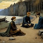 A stunning Art Nouveau scene featuring a woman with flowing red hair, wearing a turquoise garment, seated beside an ornate urn, against a serene landscape with a sunset backdrop.