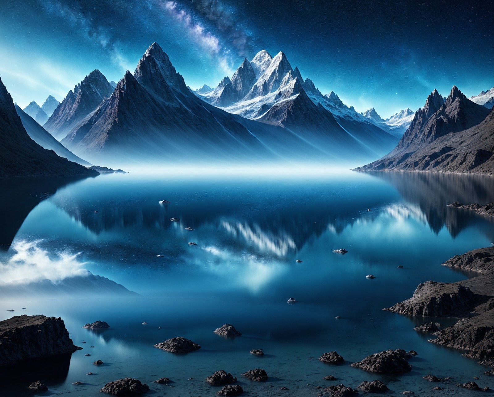Planet Earth suspended in a cosmos of stars, below it an expansive sea shimmering with the reflections of the galaxy and a rugged mountain range casting long shadows as it pierces through the water, digital painting, blue tones dominate evoking a mysterious ambiance, ultra-realistic, octane rendering.