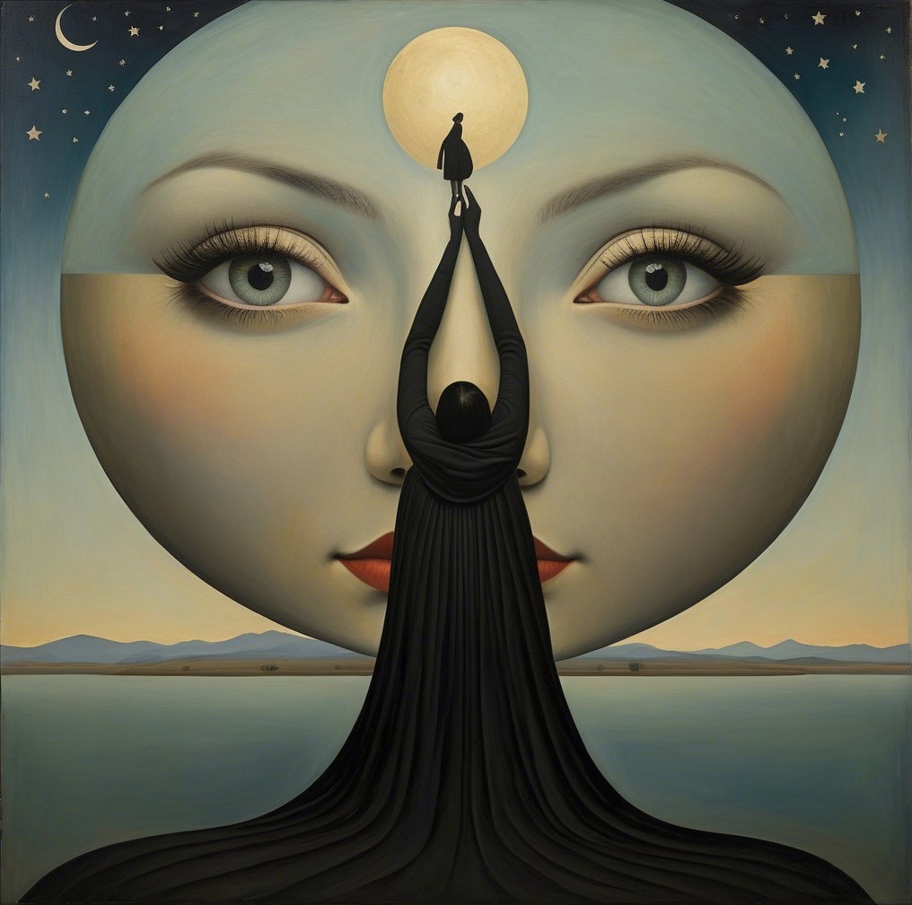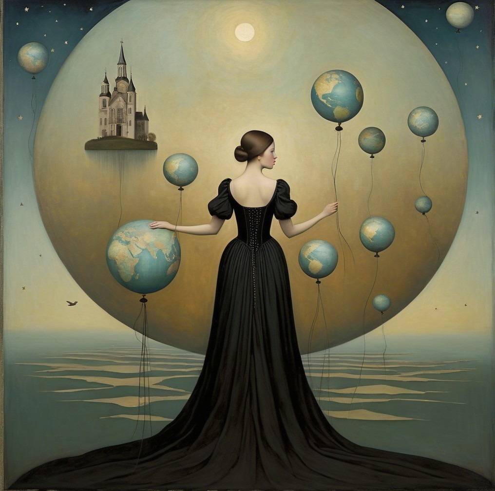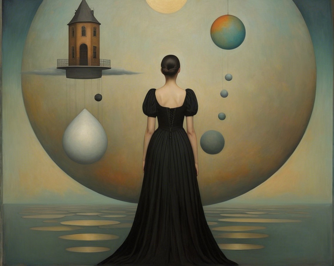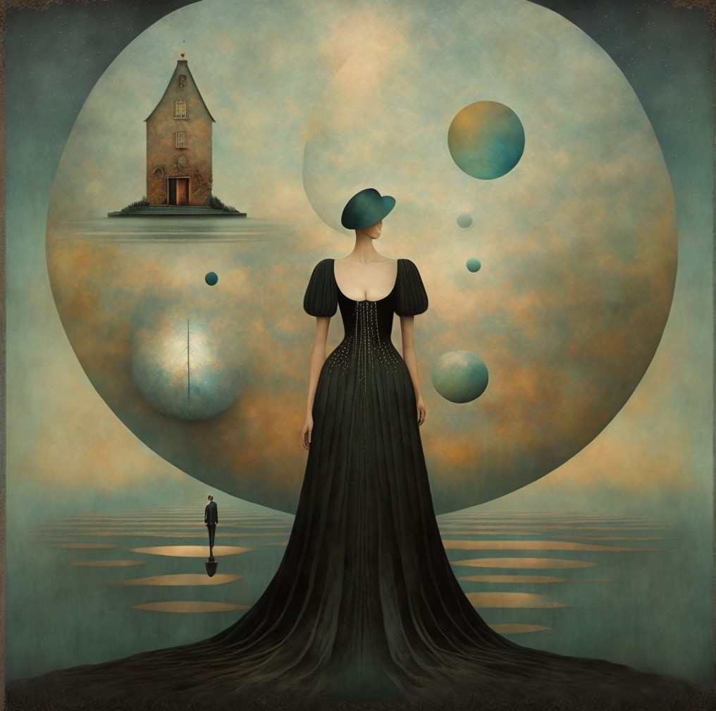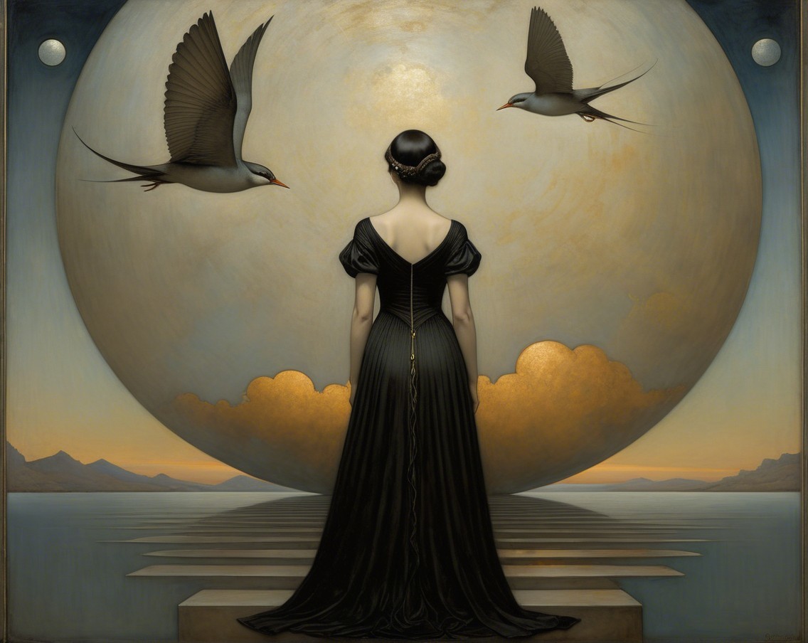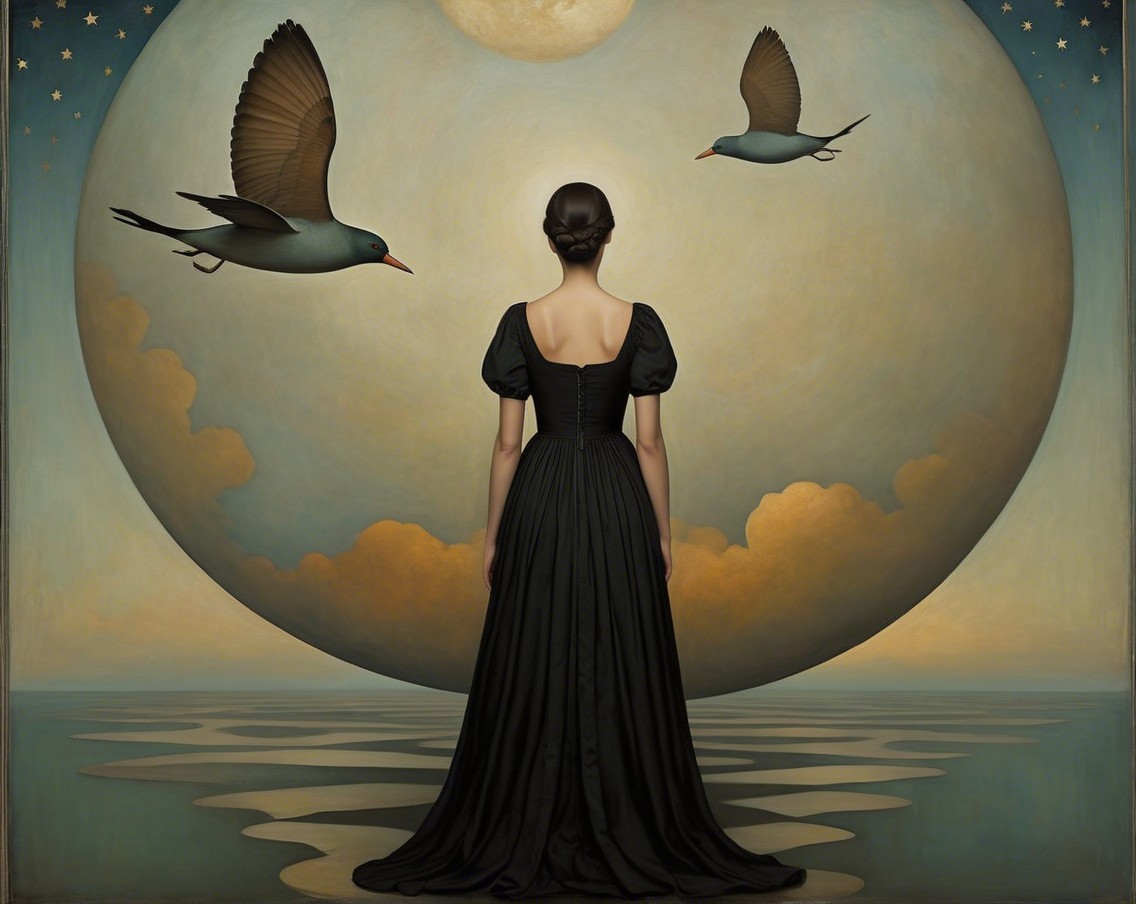 A figure in a black gown stands with their back turned, holding a key, framed by a glowing circular backdrop. Two birds fly around, adding a sense of mystery and serenity to the scene.