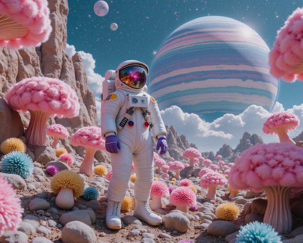 A vibrant, ethereal scene features a woman adorned with flowers and jewels, surrounded by colorful swirls and butterflies, against a fantastical backdrop of swirling skies and distant castles at sunset.