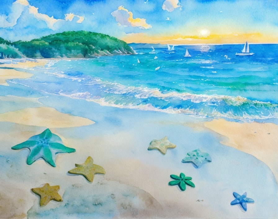 Prompt: Sand Dollar Island. A magical place where sand dollars wash up on the shore. ((Add sand dollars to beach.)) Sand, beach, ocean, waves, sand dollars, blue sky. In the style of Paolo Pino, Matisse, Klee, Chagall.