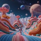 An astronaut walks through a vibrant, surreal landscape of swirling colors and abstract mountains, adorned with fluffy pink trees and a cosmic backdrop of planets and a galaxy.