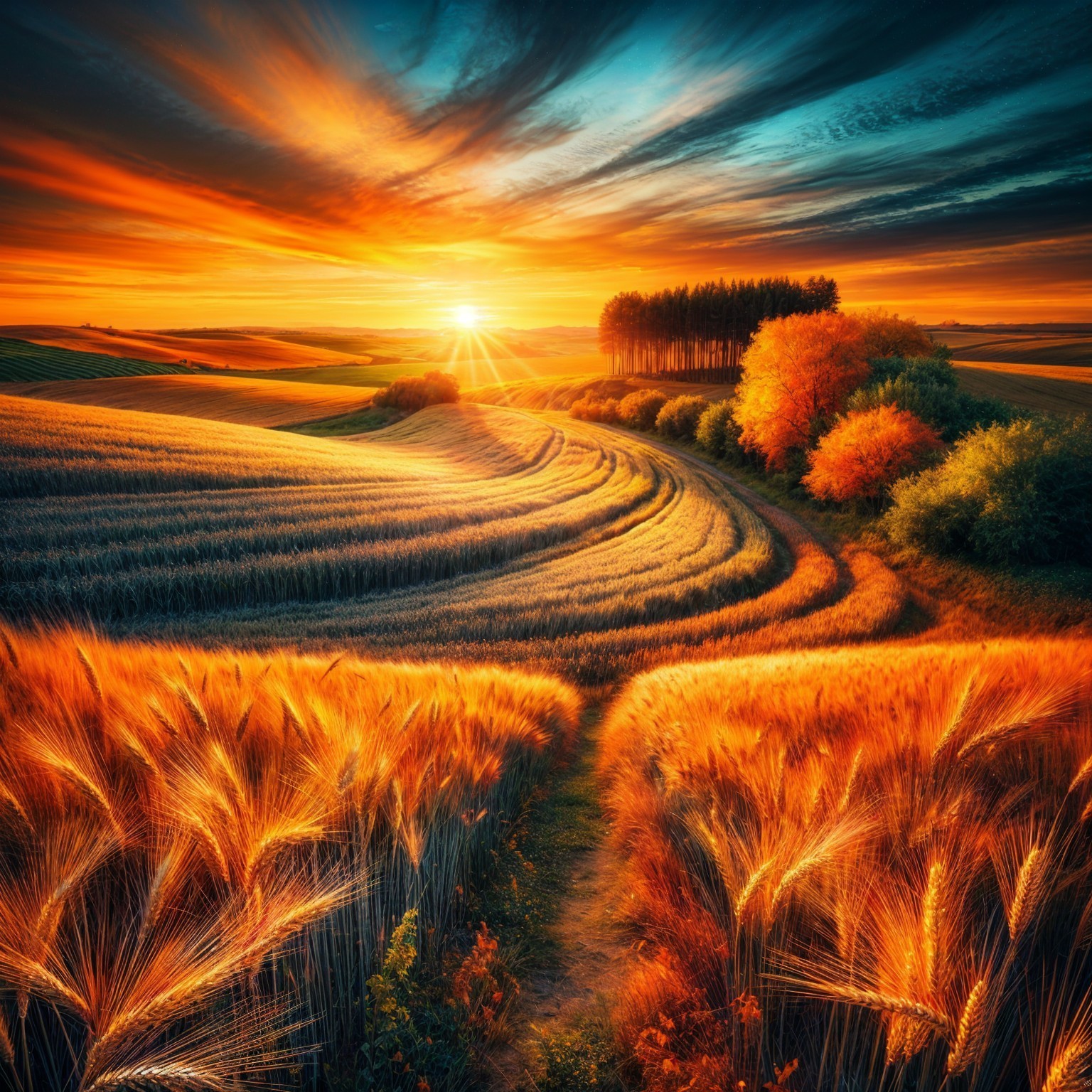 A breathtaking autumn landscape features golden fields framed by vibrant red and orange trees, with a radiant sunset casting long shadows and warm light over the serene scene.