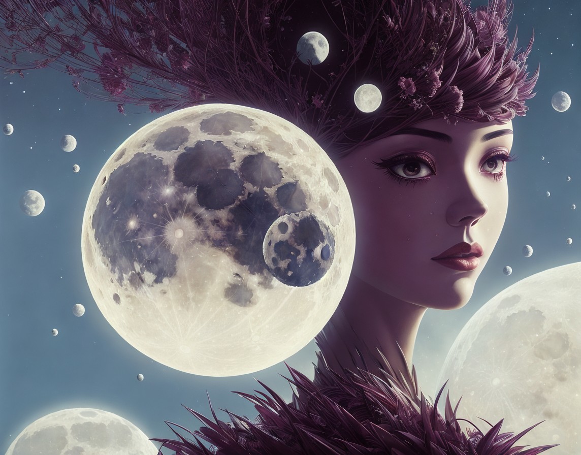 Surreal portrait of woman with crimson foliage headdress and oversized moons in starry sky