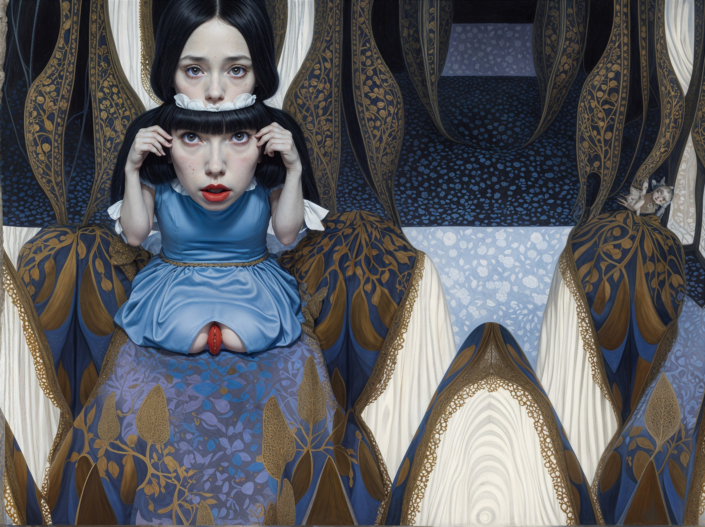 This surreal artwork features a girl with dark hair in a blue dress, pulling her own face, surrounded by flowing patterns and textures. The mood is eerie and dreamlike, evoking a sense of intrigue.