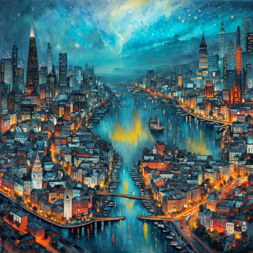 Surreal cityscape painting: vibrant dusk scene with starry skies and river reflections